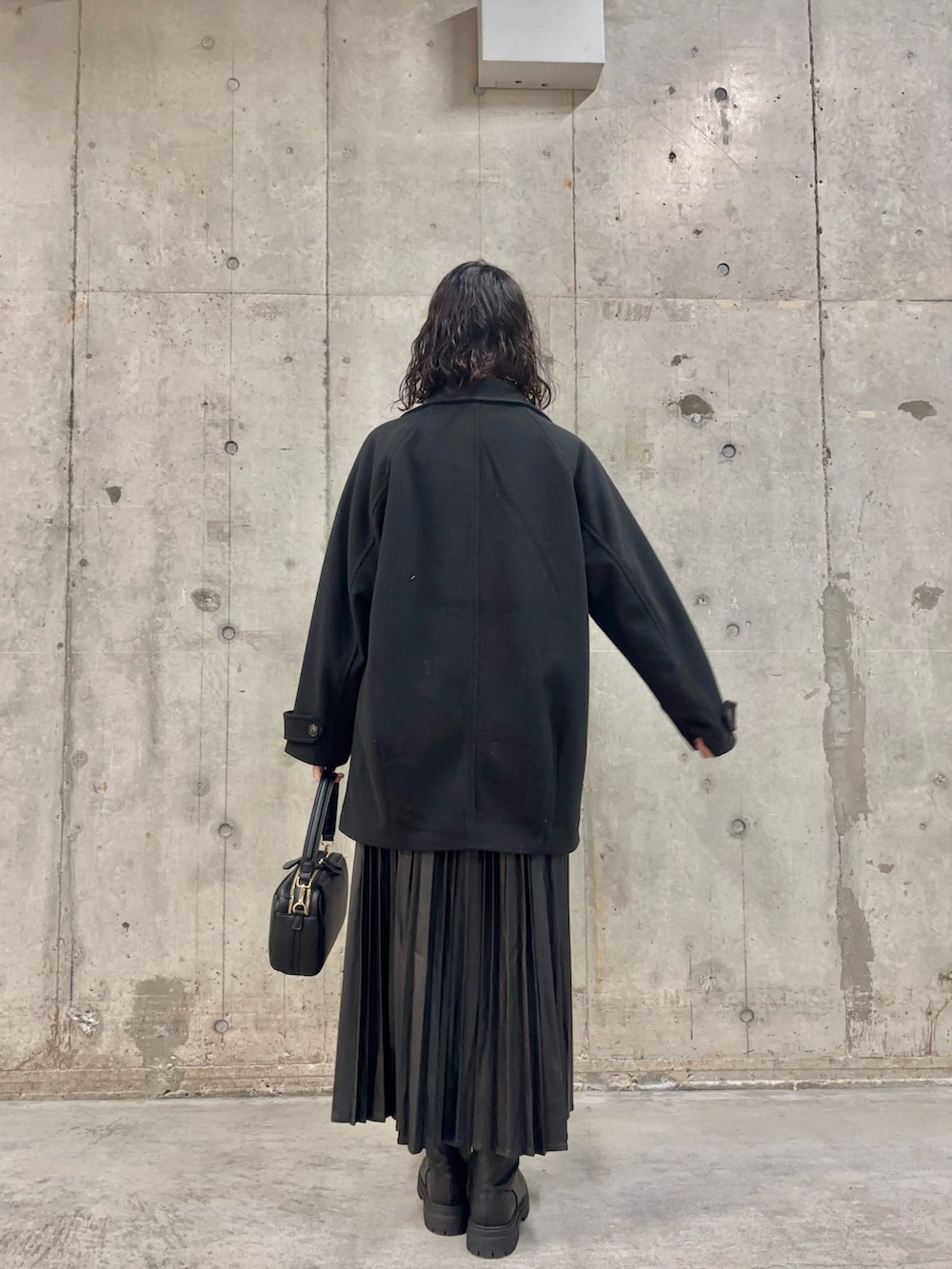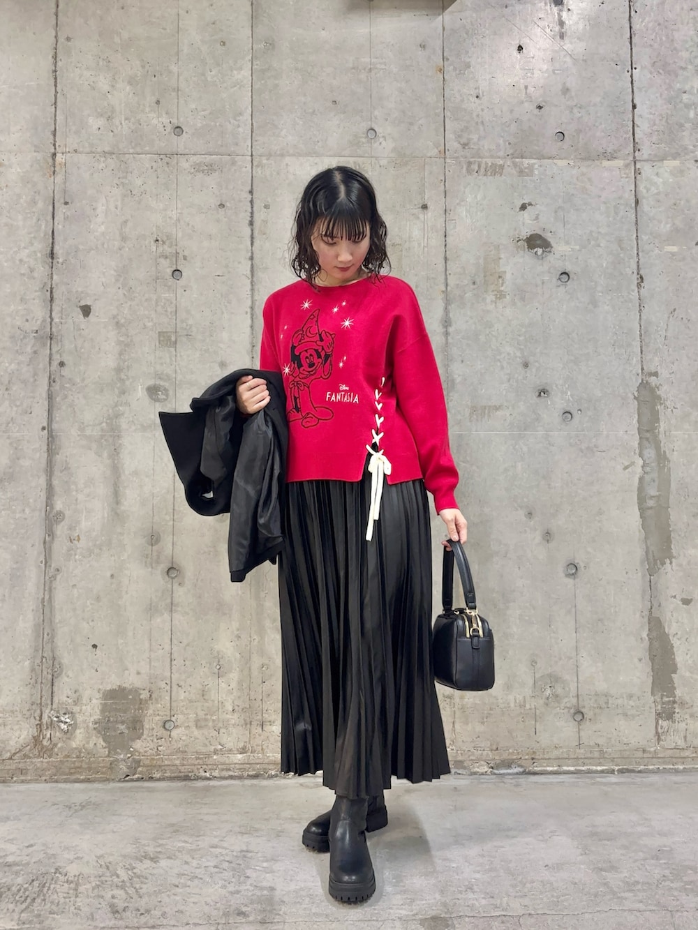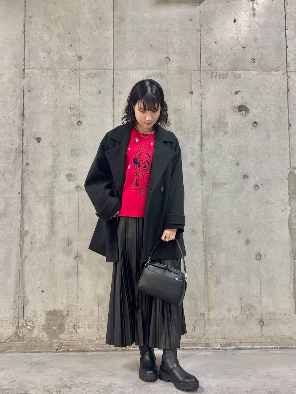 赤のニットが映えるよう、ミドルコートとフェイクレザーのスカートなど黒のアイテムで揃え、一緒にお出かけされる方とも合わせやすくしてみました❤️🐭