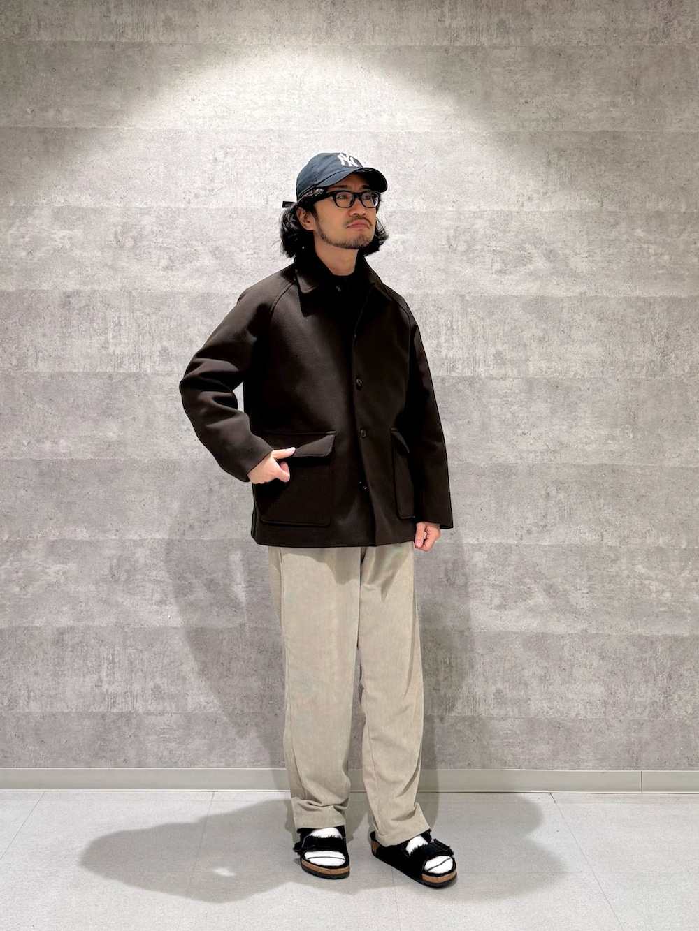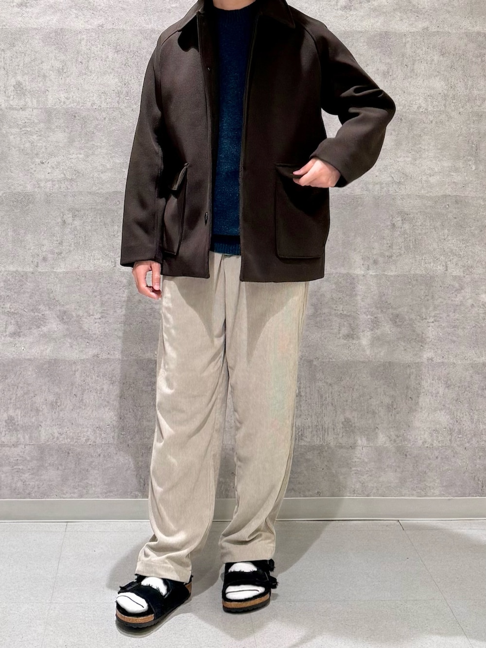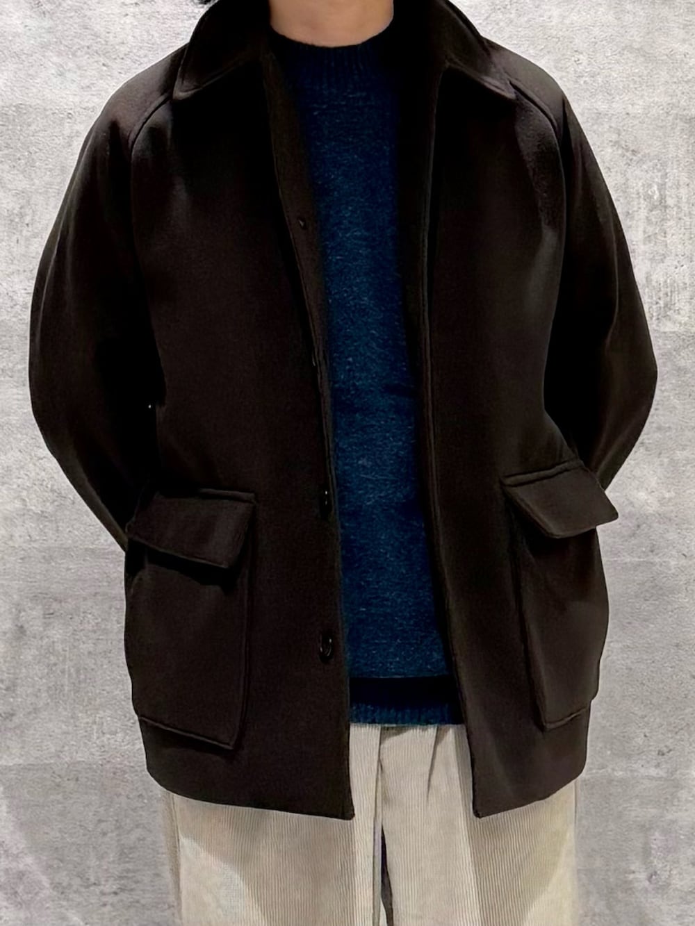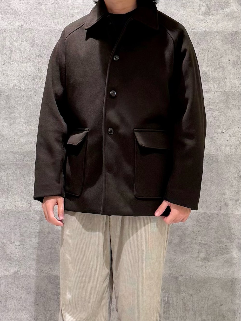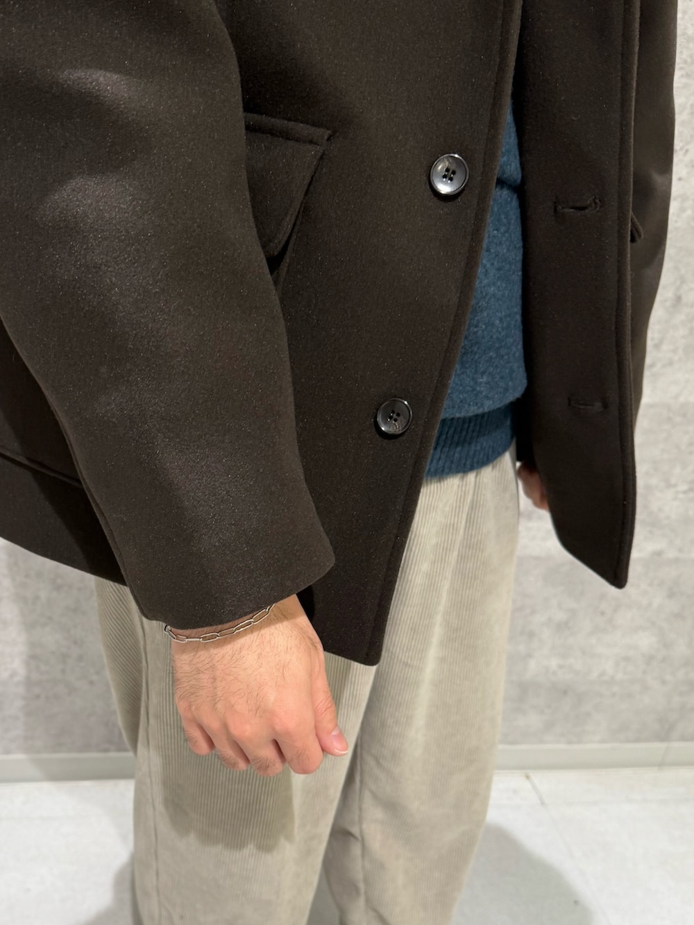 お尻がすっぽり隠れるくらいの丈感でジャケットとショートコートの中間みたいなバランスで人を選ばないアイテムです。