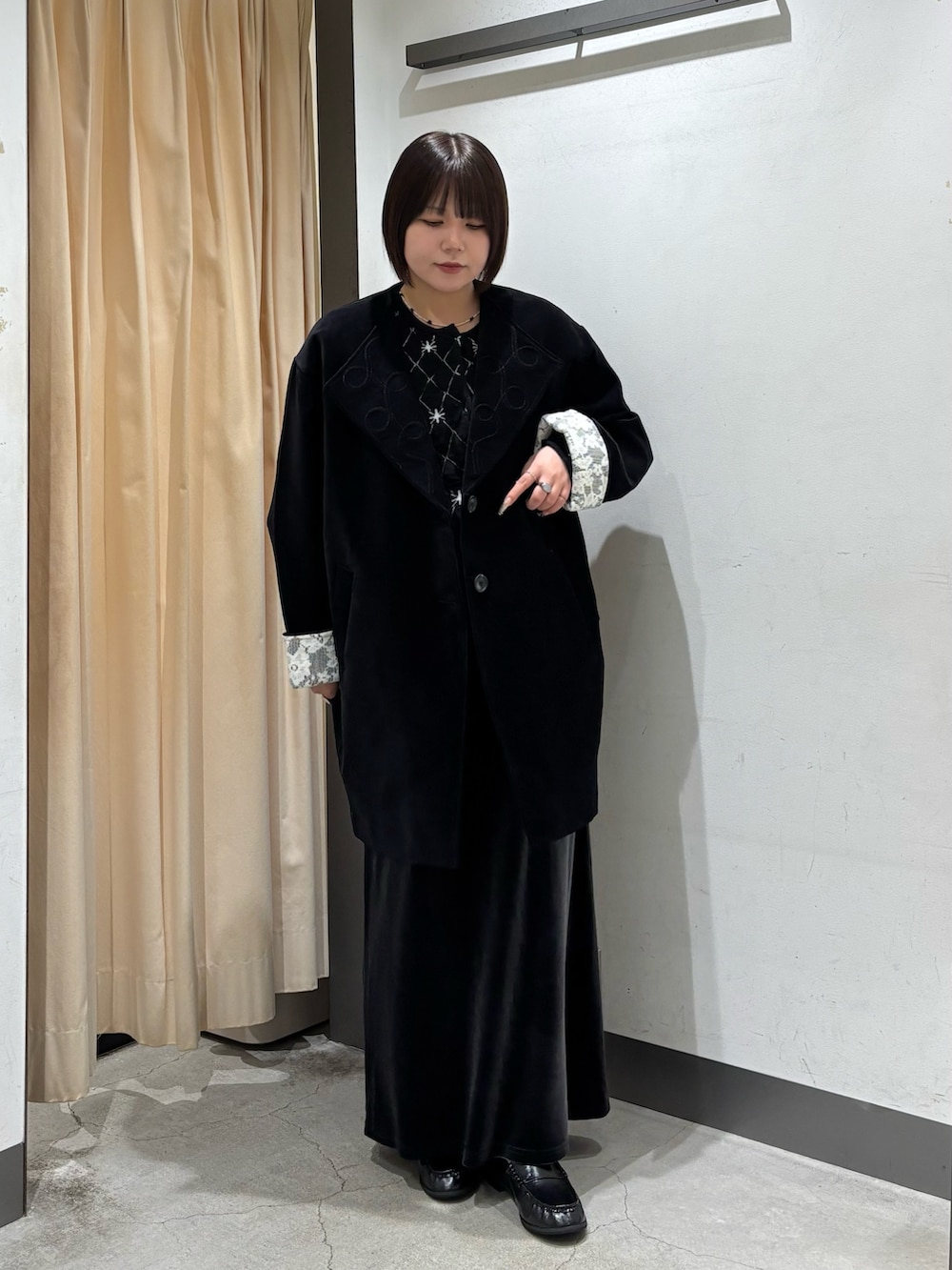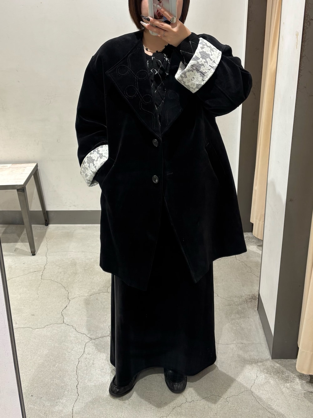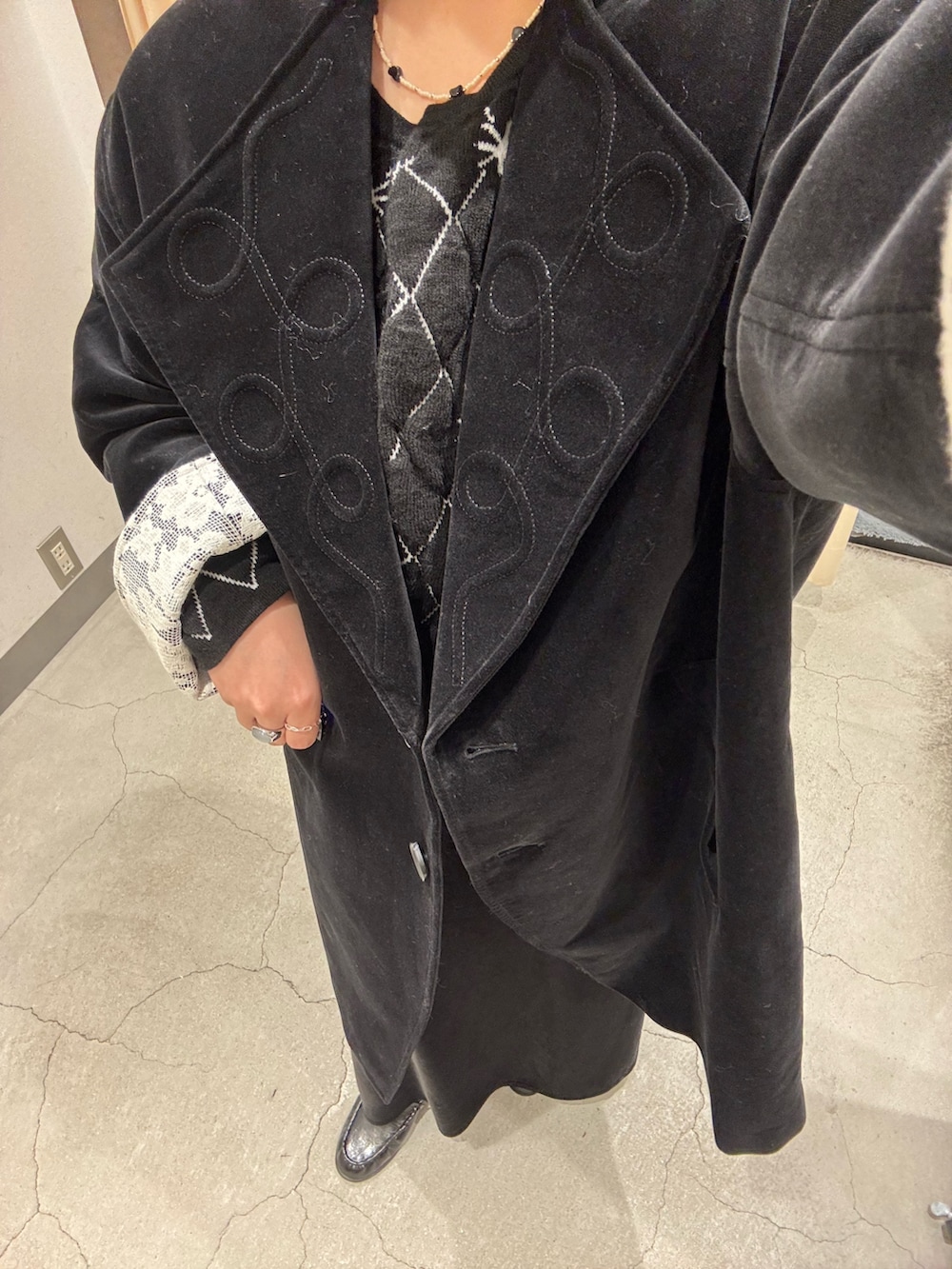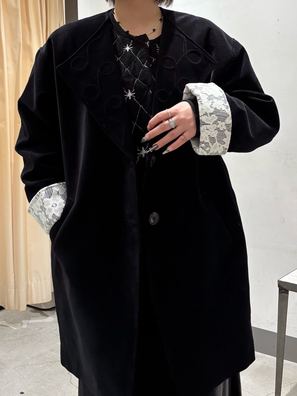 ベロアのモード感に袖口のレースが相まって更に雰囲気のあるアイテムに...!!胸元に立体ステッチもあったりと細かなディティールまでこだわっております🫶🏻