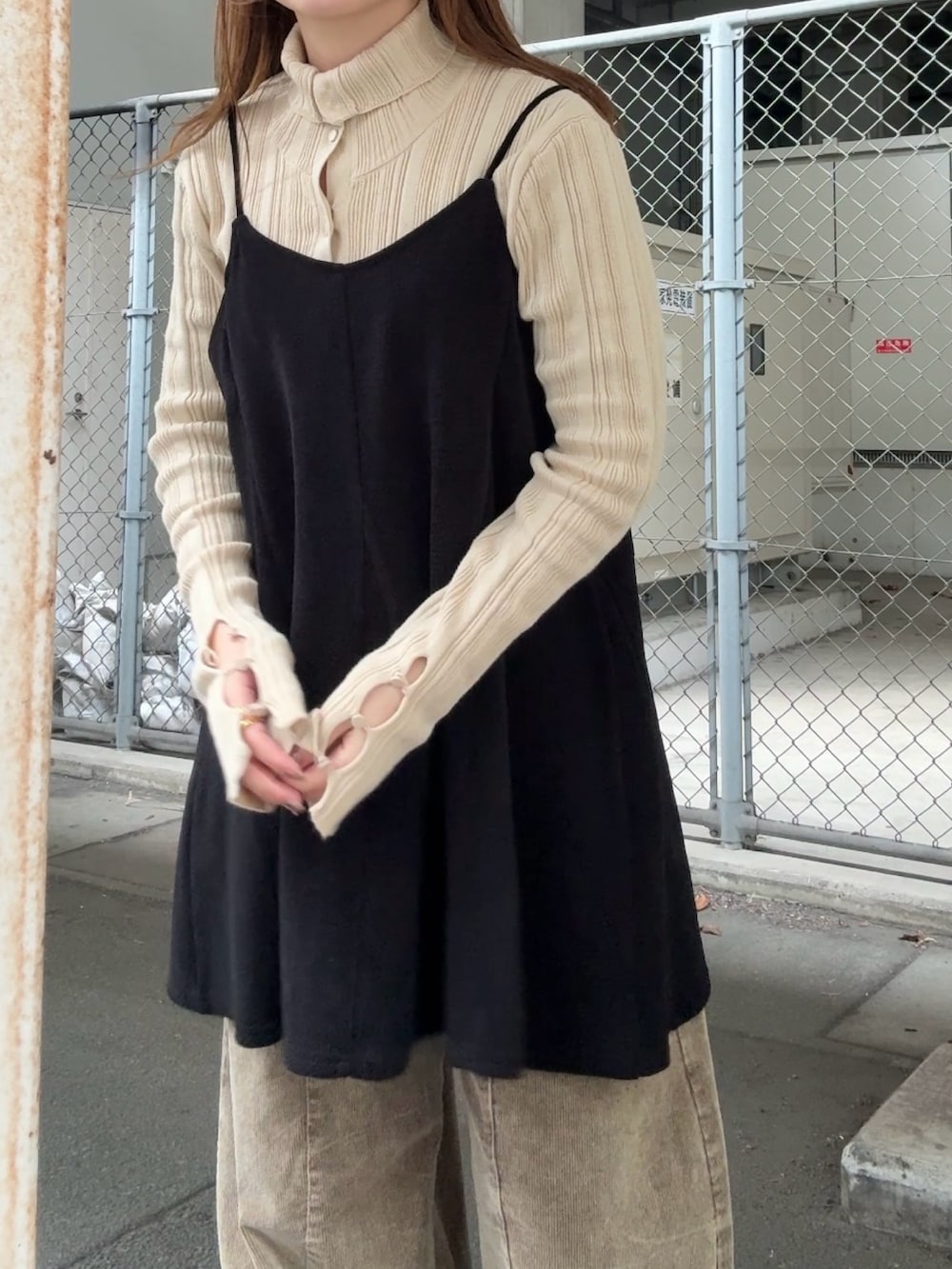 モールリブミニワンピースは、ゆったりめパンツと合わせているので1番短く肩紐を調整してます!ワンピースとして着る時は、少し長めにしていただくのがおすすめです^^