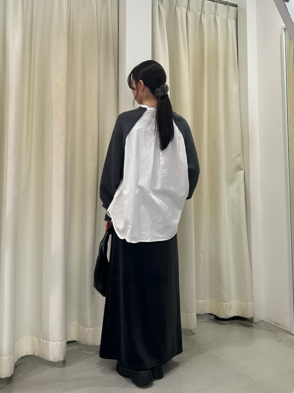 ゆるっとしたシルエットながら上品さもあり、黒スカートと小物でまとめてスマートに仕上げました😌🤍
