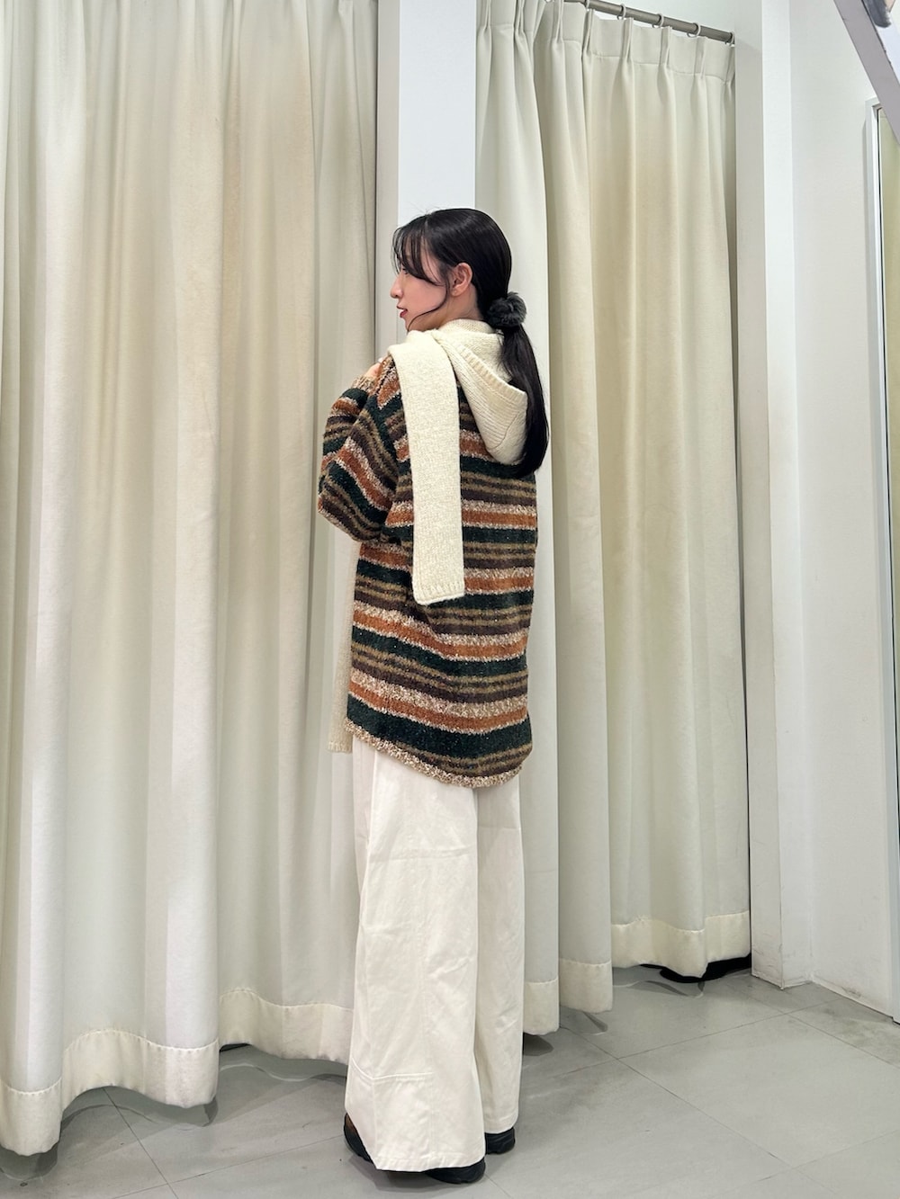 肩にかけたアイボリーのフードマフラーで抜け感をプラスして、秋冬らしいあったかムードにまとめました❤️
