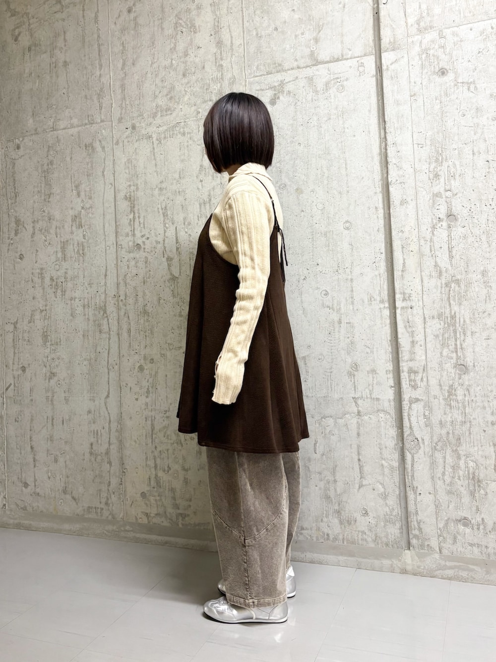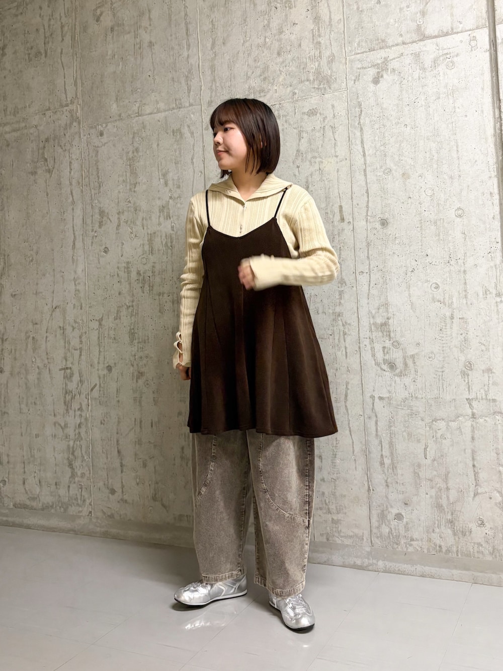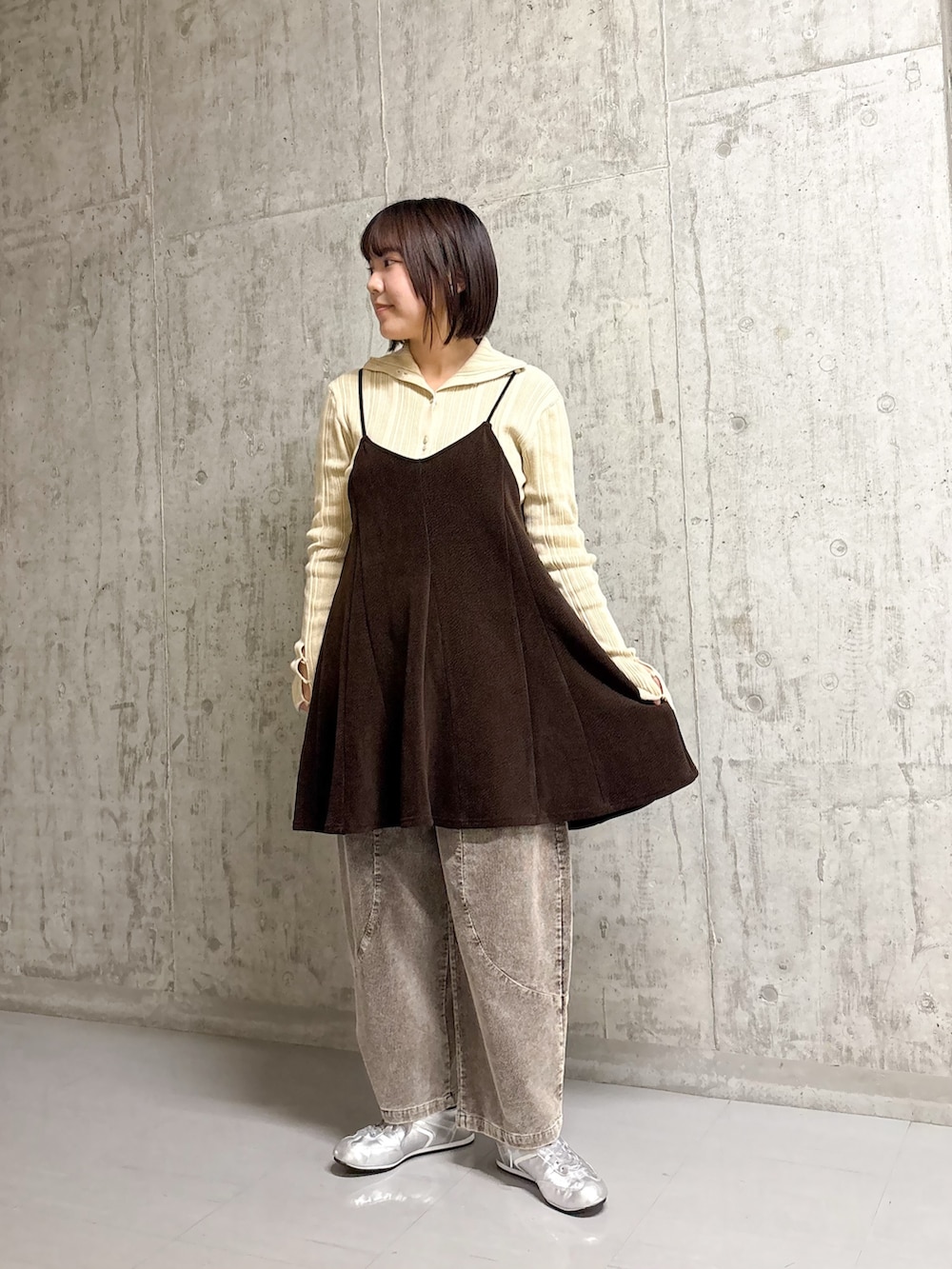キャミワンピはゆったりしているので、中にスウェットやニットも合います💖