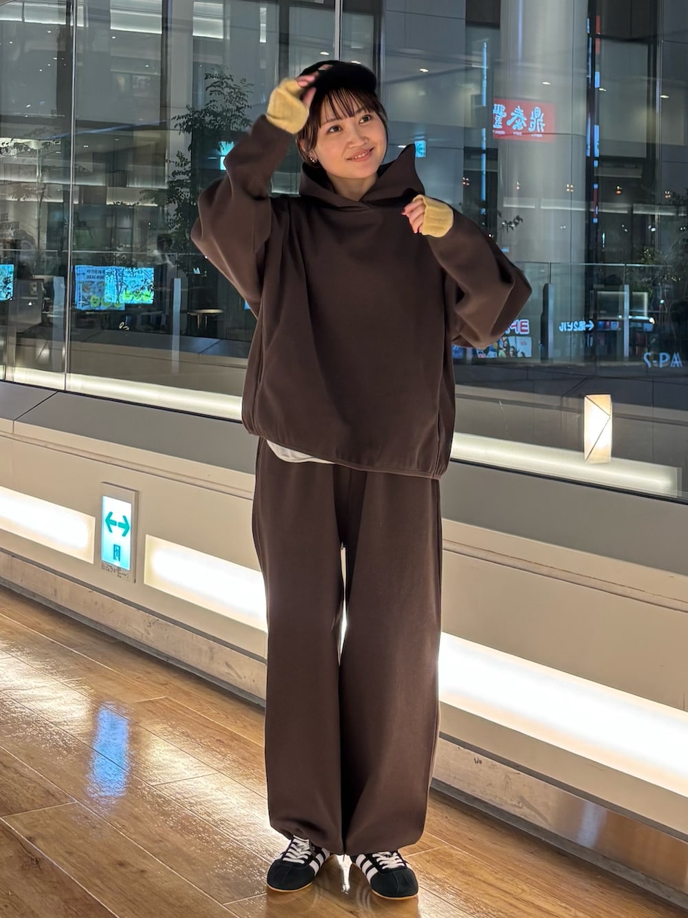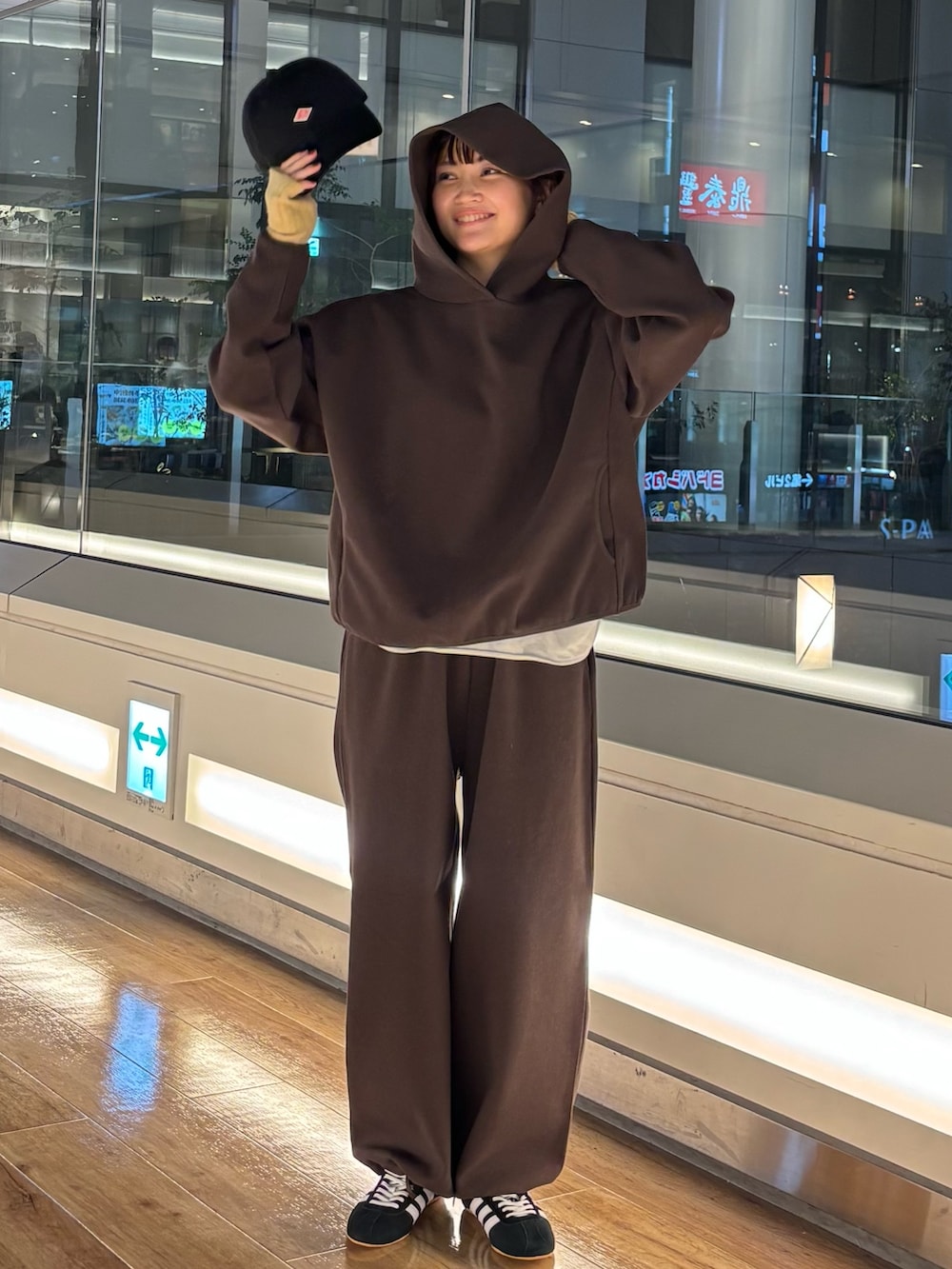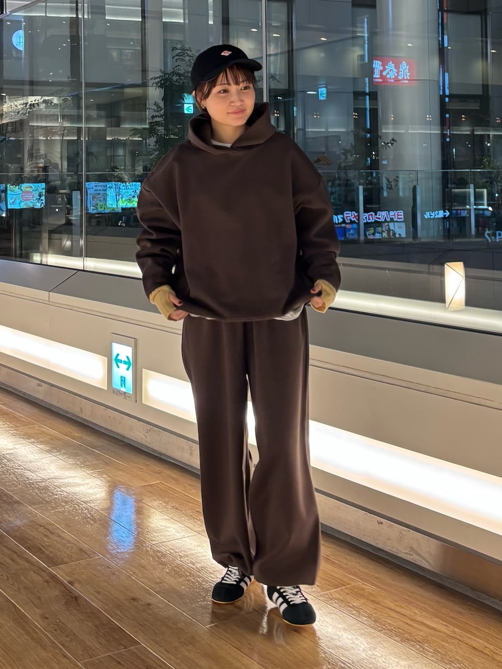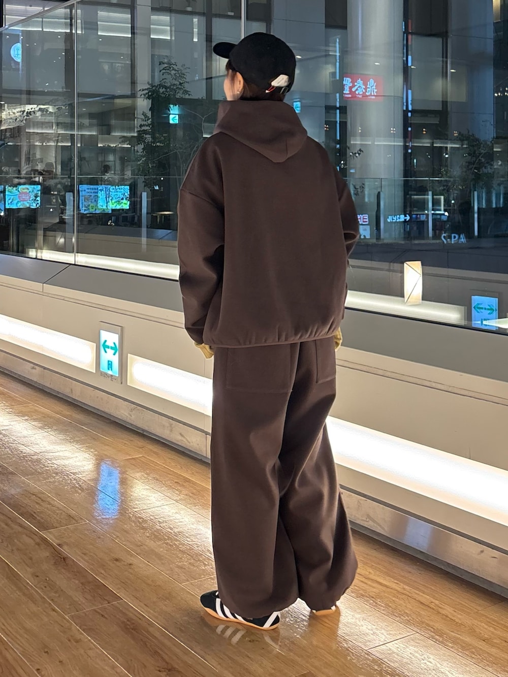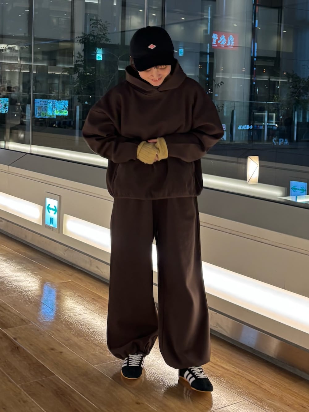 メンズスタッフのコーディネートでウォームドジャージのセットアップを着用しています!