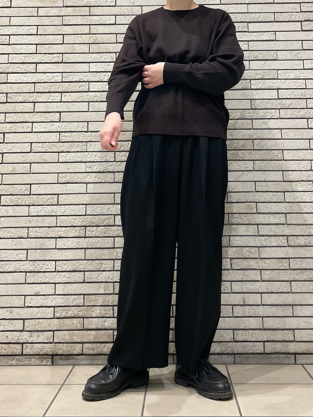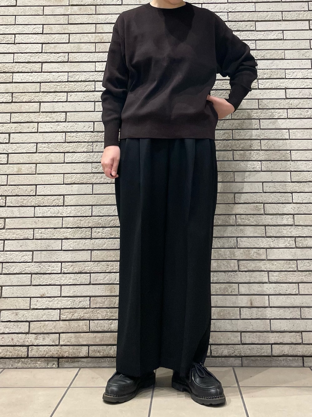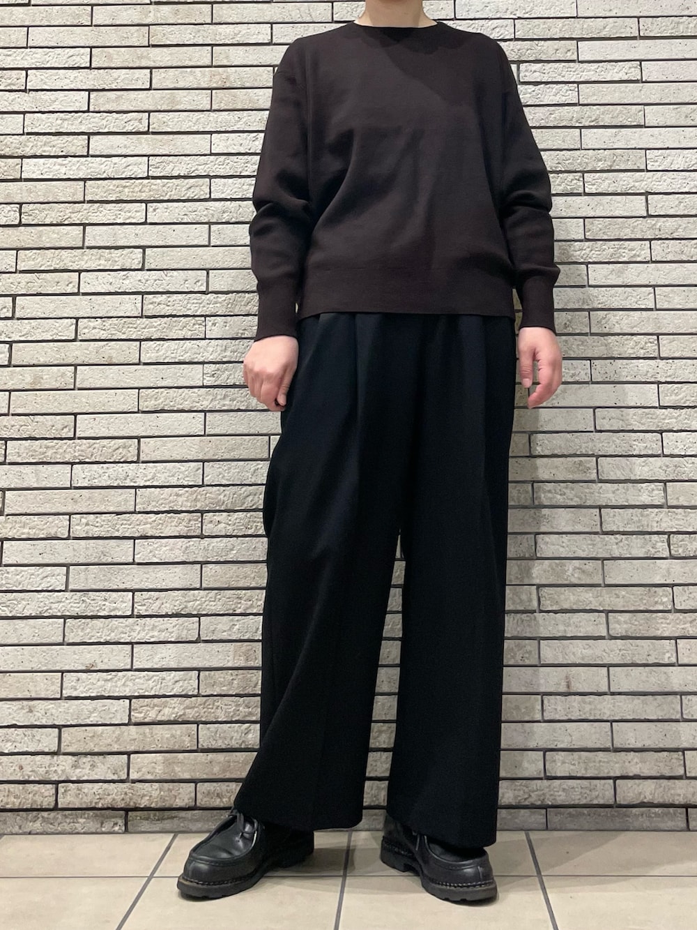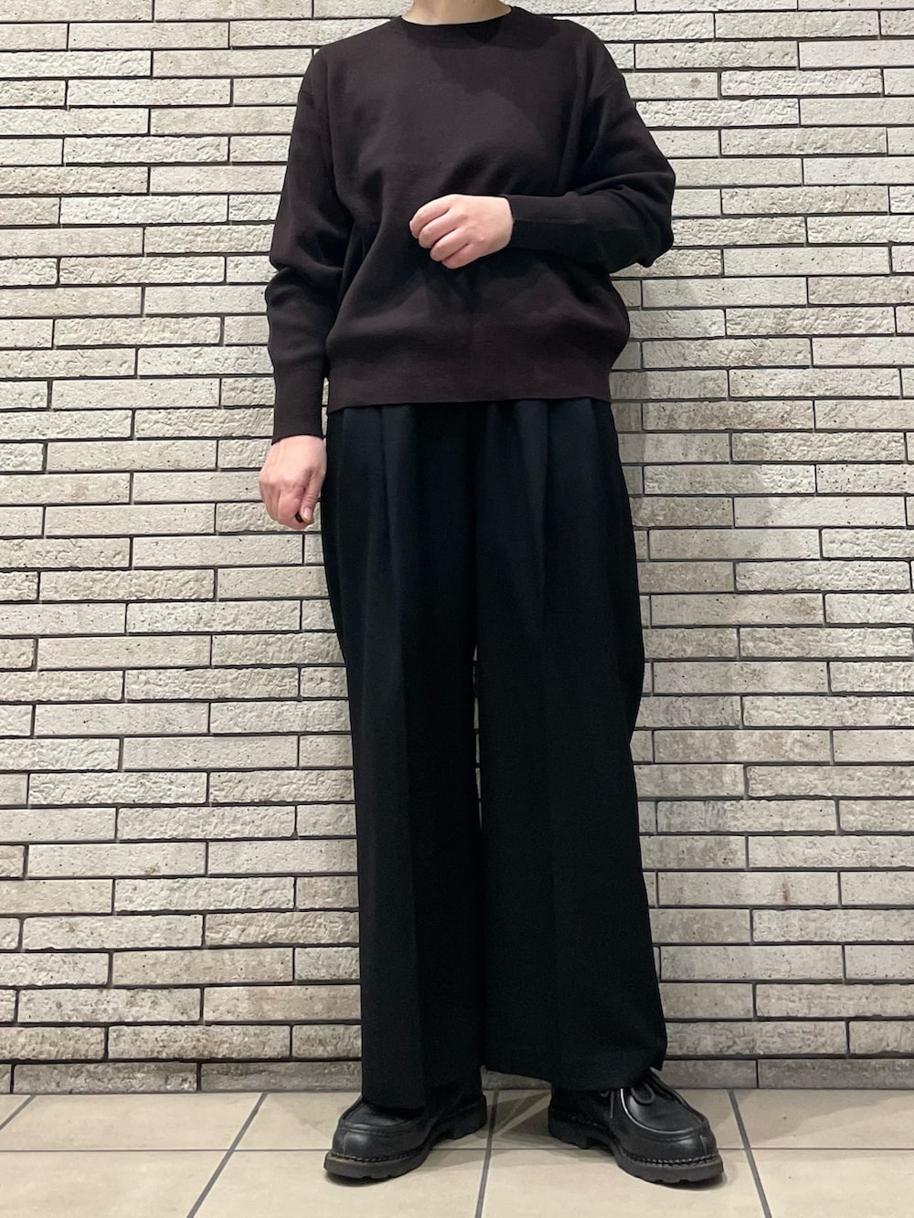 シンプルニットはボトムによって、スタイリングの雰囲気をかえていただけます◎今回はスラックスと合わせてキレイめな装いに。