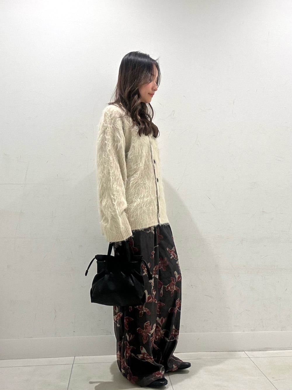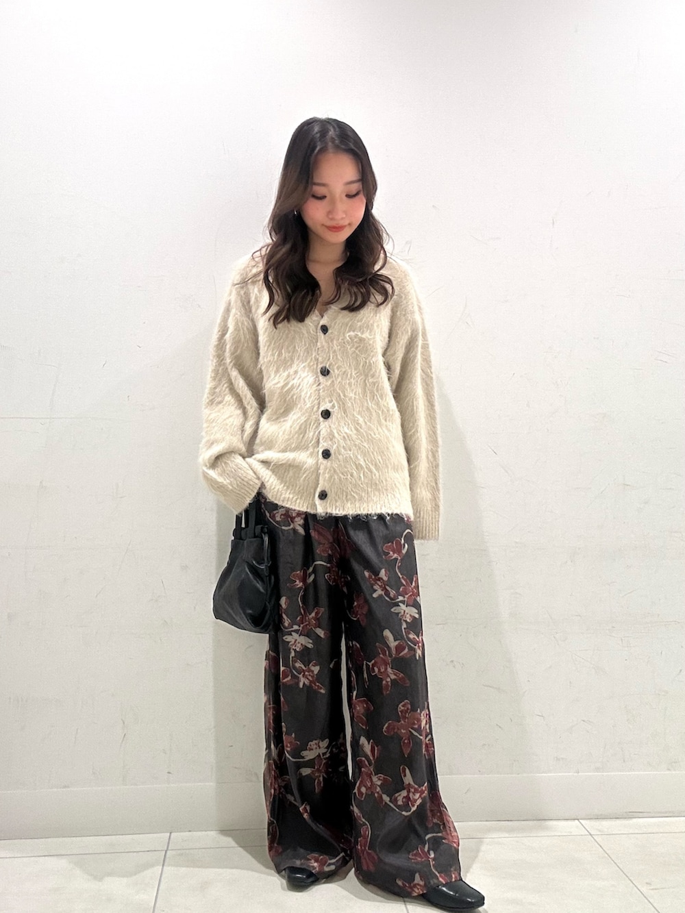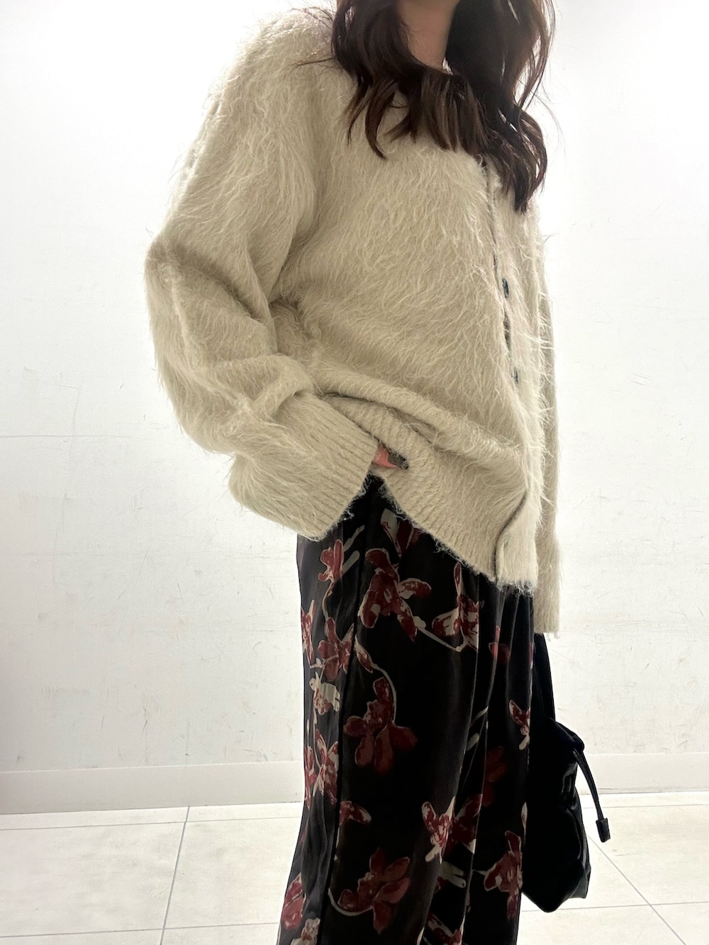 カーディガンはさらさらふわふわでトレンド感のあるシャギーニットです