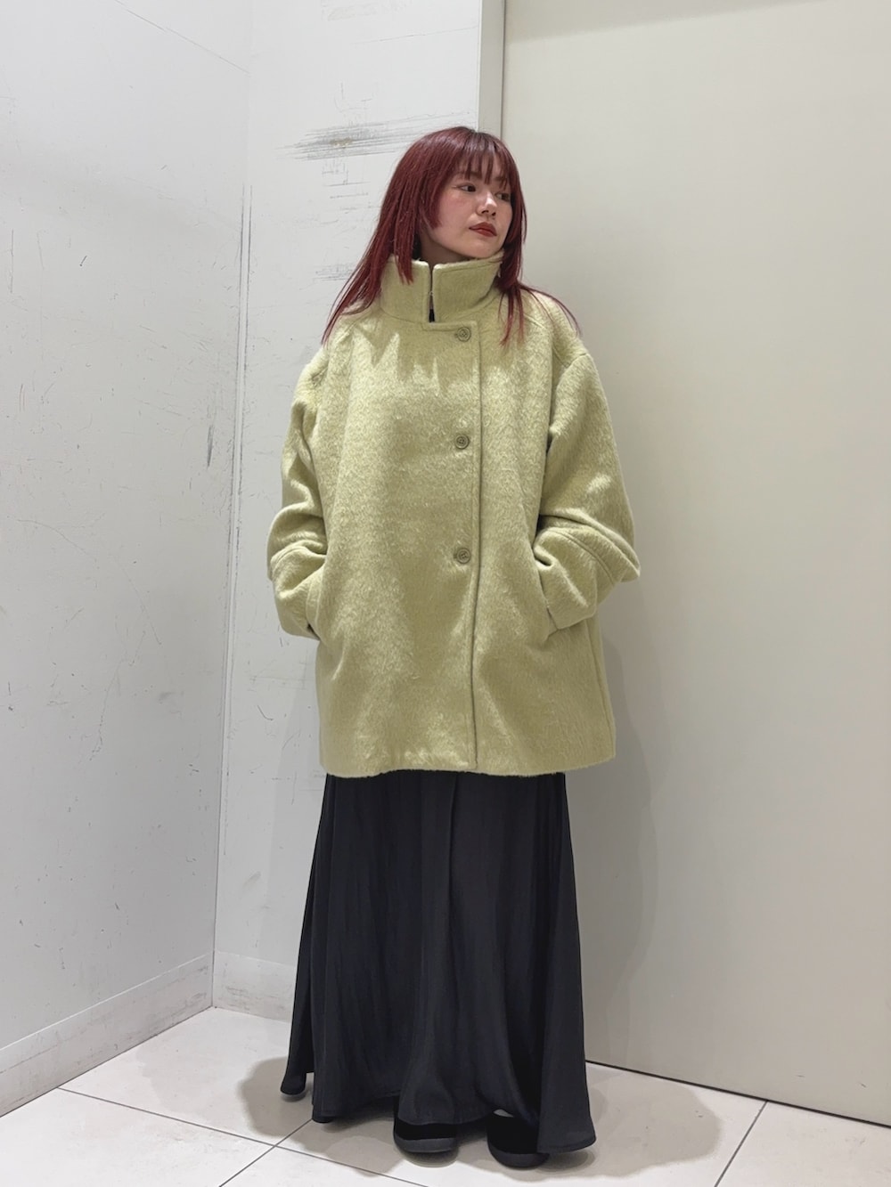 このマルチカラーシャギーコートは襟元開けたり、襟を立てて着たりと色んなアレンジして楽しめます!厚手のニット着ても着膨れしないのでオススメです!