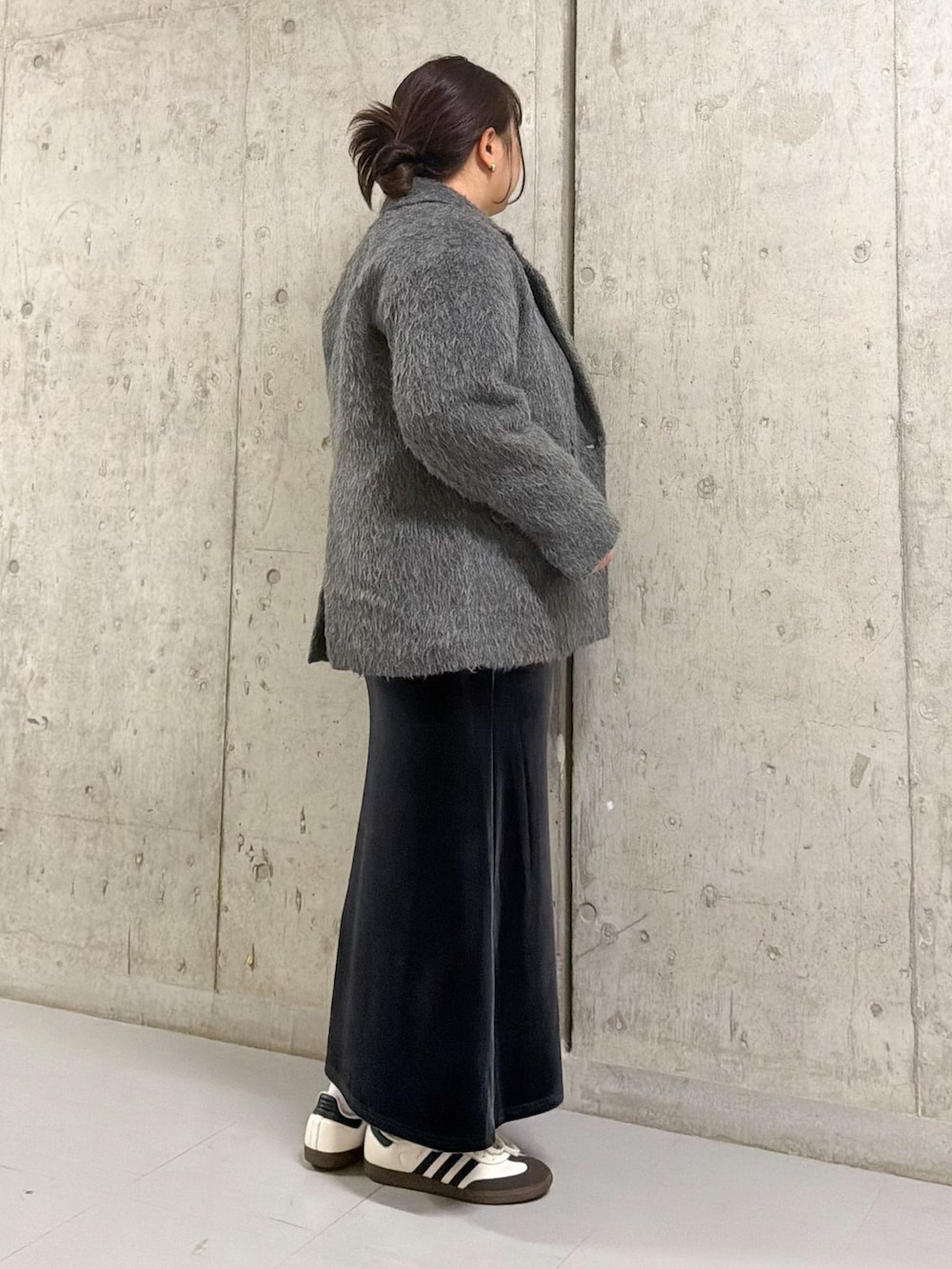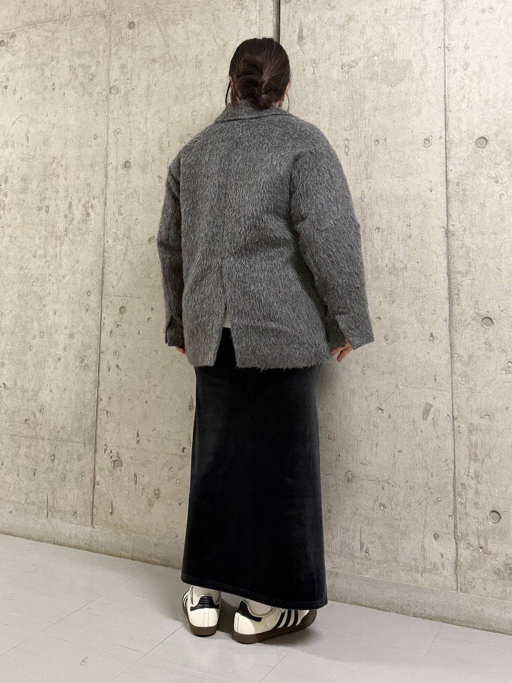 ベロアスカートはウエストゴム仕様で穿きやすく、シルエットも綺麗で◎