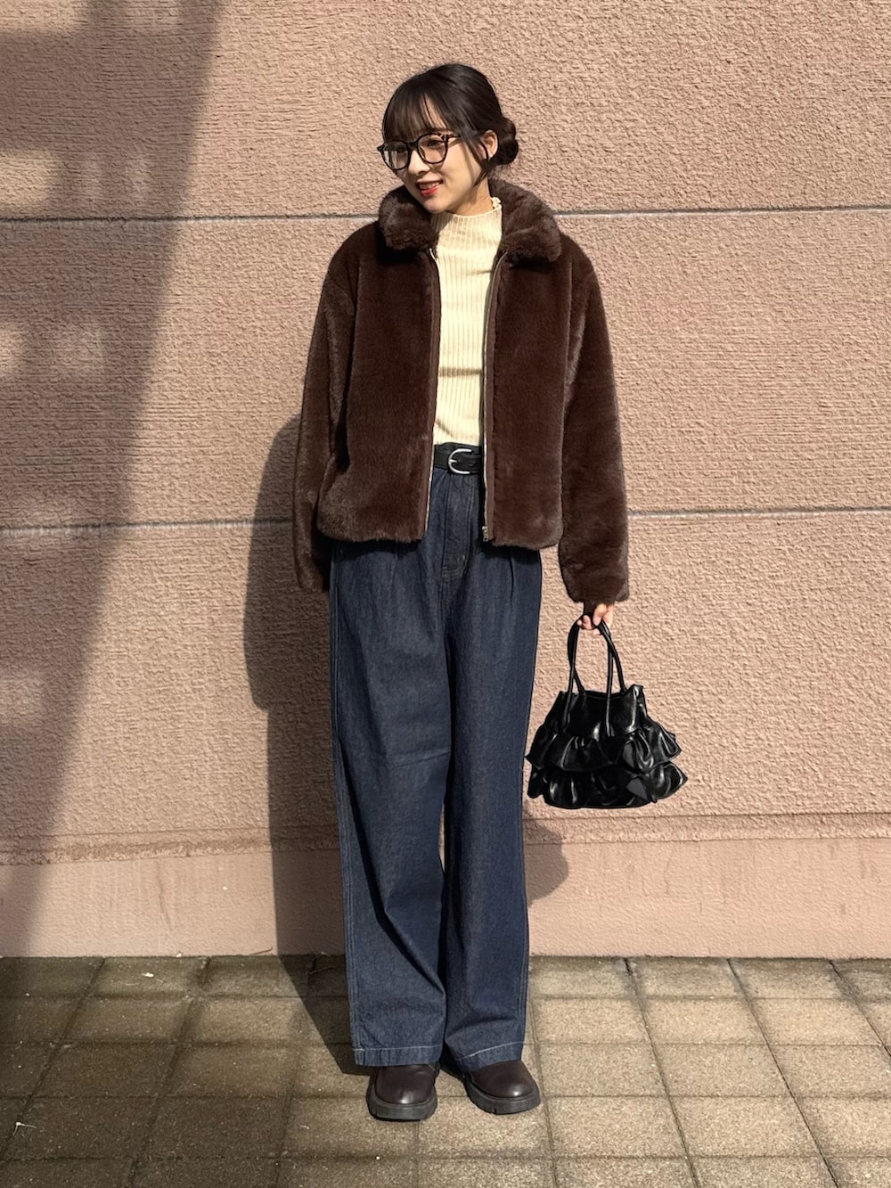 アウターはファージャケットで色味とシルエットがとても可愛いアイテムになっています!ふわふわでとても暖かいです!丈も長すぎないので着やすいです!