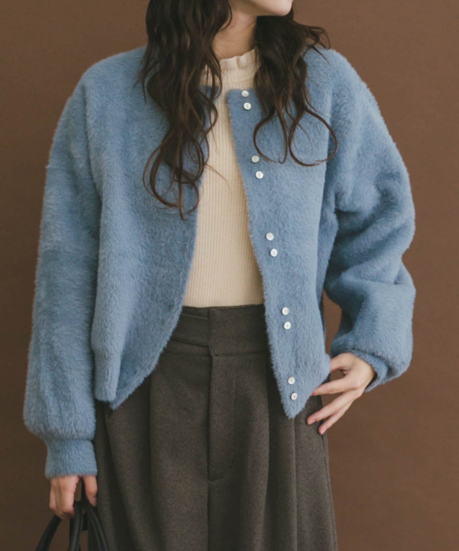 手触り良く着心地抜群のニットは淡い水色が御顔写りも◎