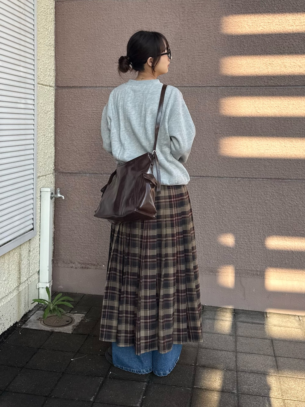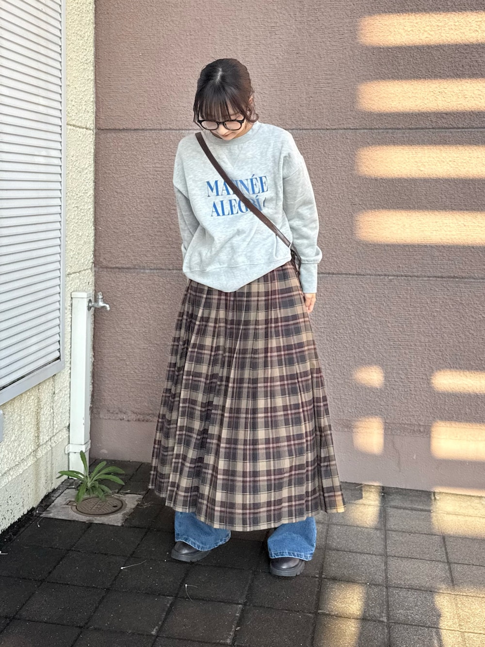 ボトムスはプリーツスカートとデニムパンツでスカートの方はチェック柄が秋冬感あってとても可愛いです!デニムパンツにレイヤードして古着っぽくしてみました!