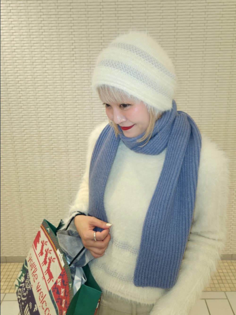 白のワントーンで今年っぽさを出しつつ、ブルーのマフラーで差し色に🩵