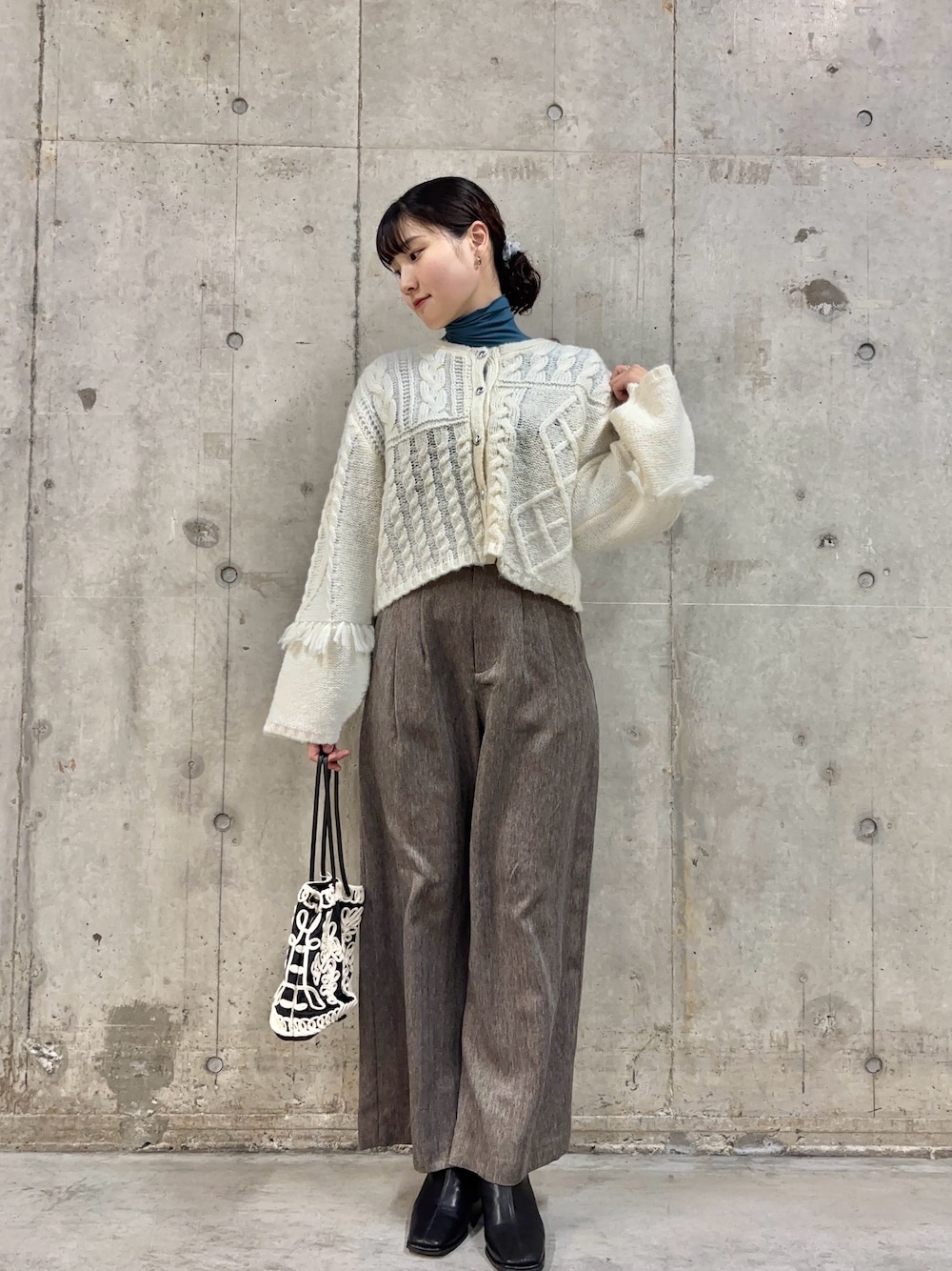 今回はブラウンの履き心地100点のスラックスを合わせました!トップスが腰周りまで隠れるので、タイトスカートやフレアデニムでも🙆‍♀️