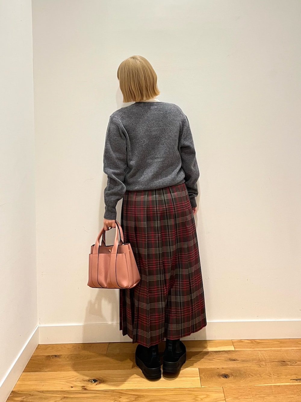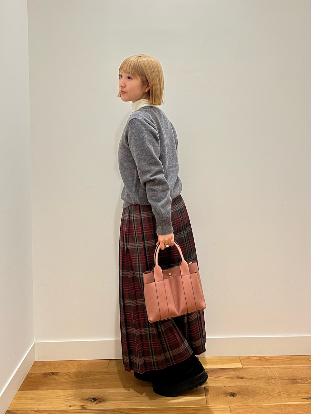 チェック柄に、しっかりと長さのあるロング丈と太めのプリーツ幅を組み合わせることで、上品さの中に程よいトレンド感をプラス◎