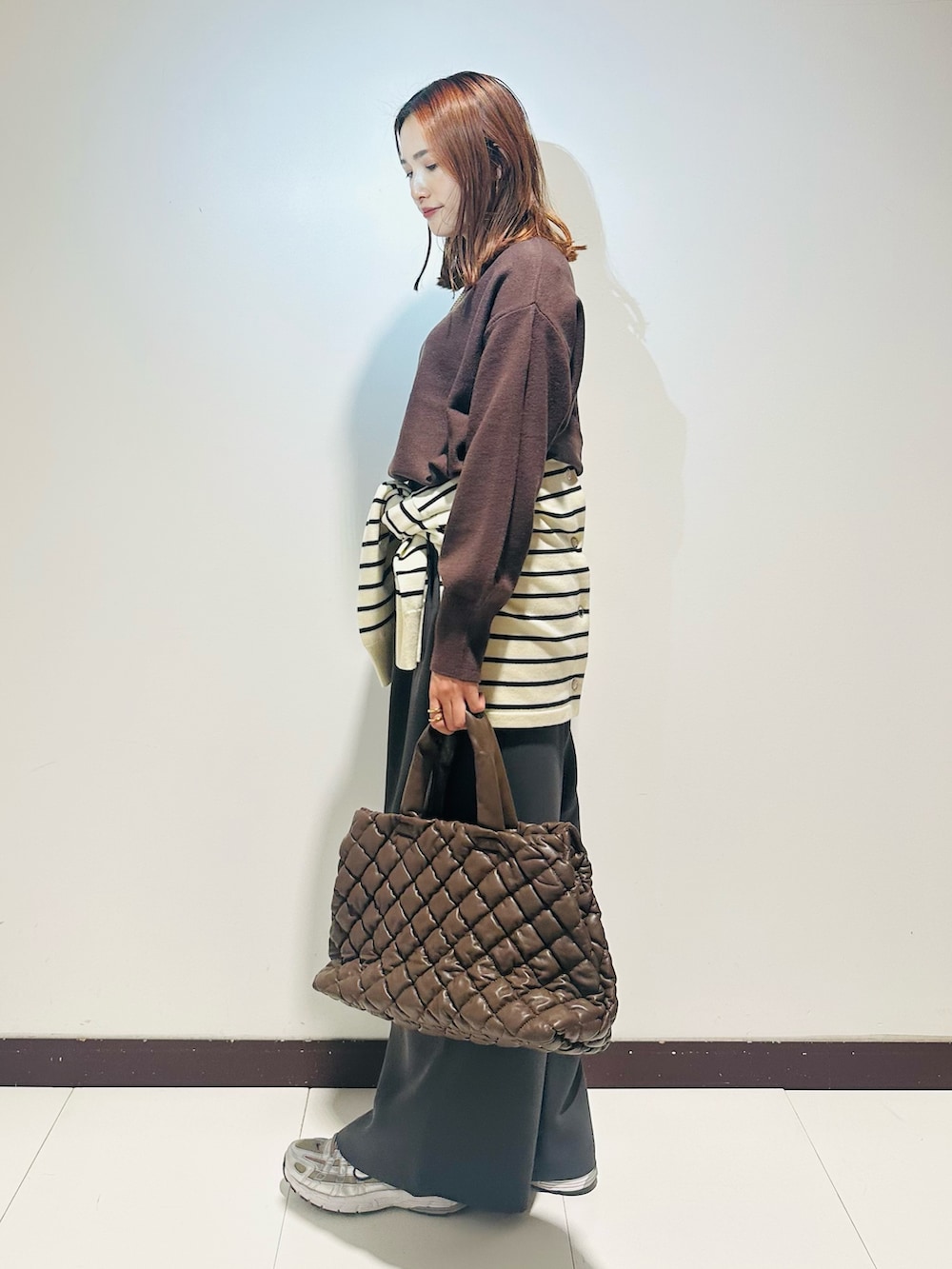 パンツは落ち感のある滑らかな素材のタックパンツ