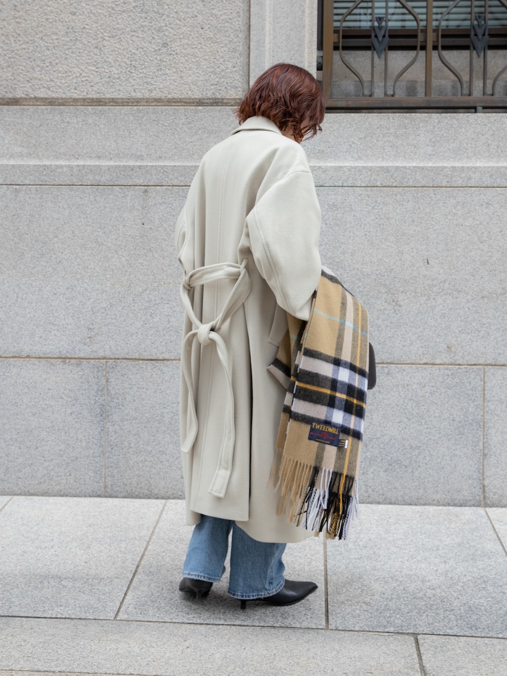 ベーシックなデザインでありながら、付属のベルトで絞ったり、首元はスタンドカラーにもできたりと、用途や雰囲気に合わせて様々なスタイリングを楽しめます。上質なウールを使用しているので肌触りは滑らかでずっと長く使っていただける1着です。