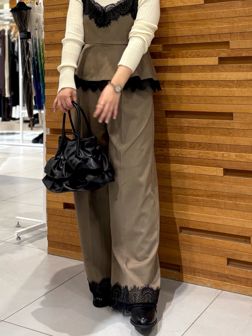 上品な落ち感のある素材を使用したオールインワンになっております☺︎胸元と裾にあしらわれた配色のレースが、華やかな印象になります♡