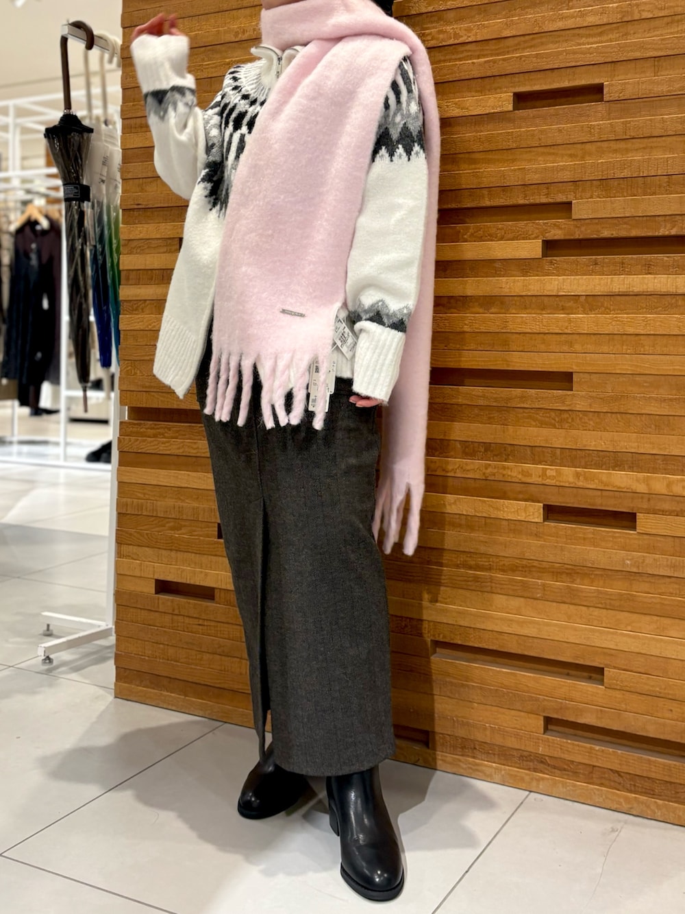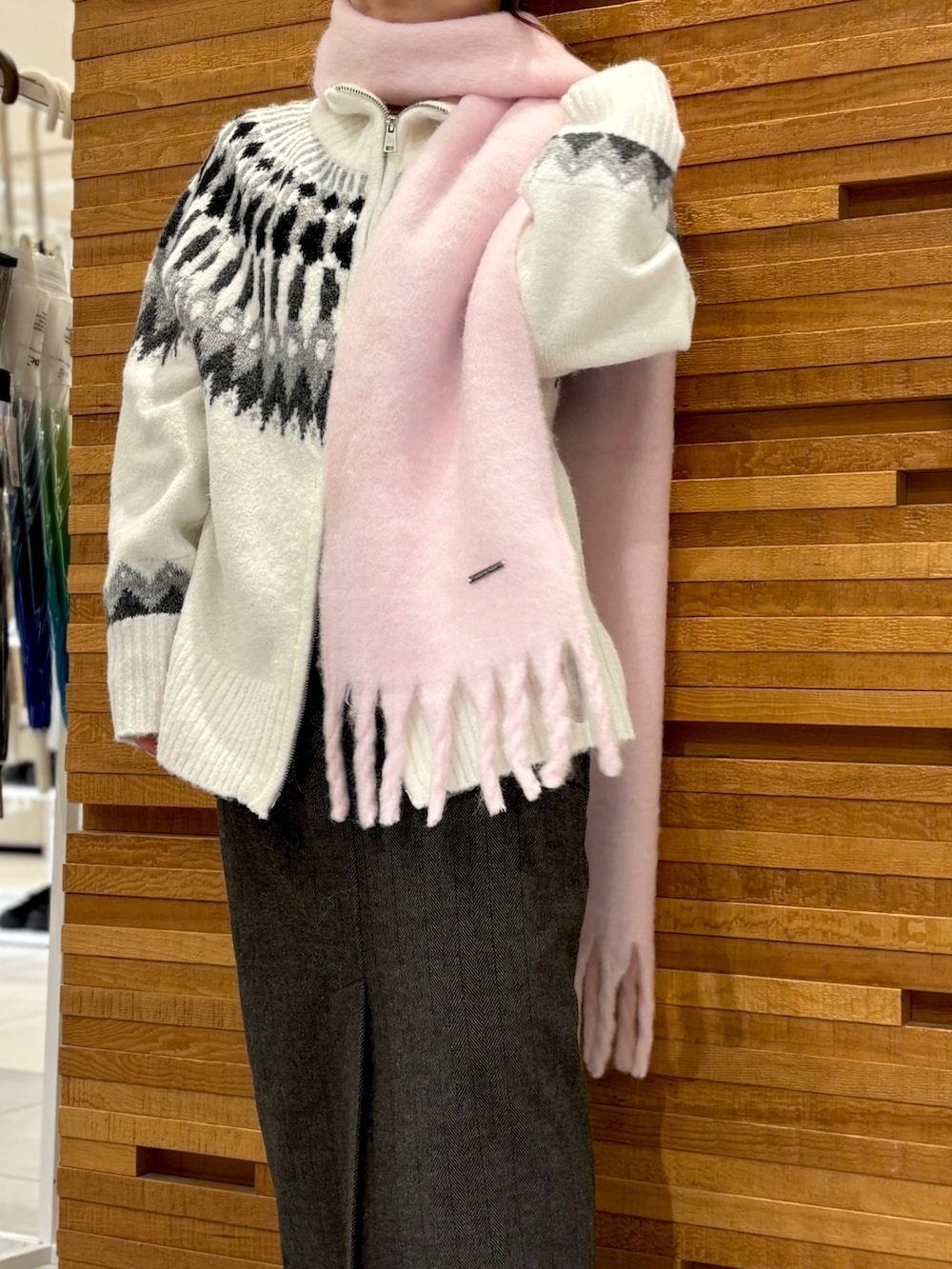 ノルディック柄のジップセーターに差し色でピンクのマフラーを巻いてみました☺︎