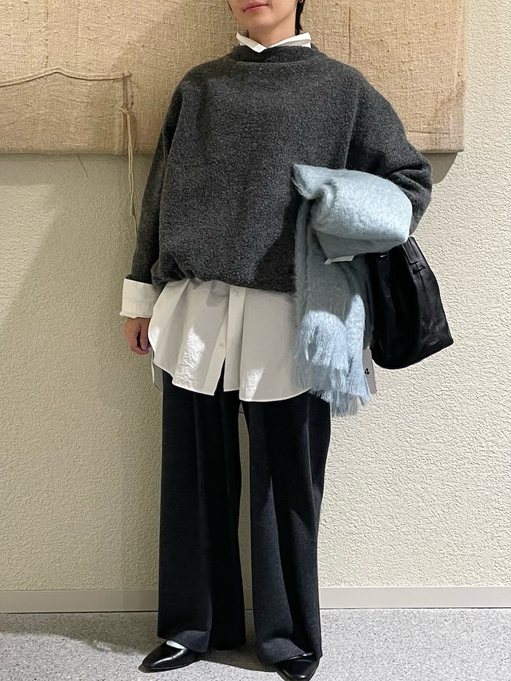 Boa pullover、こんな感じで中にシャツやブラウスを重ねて頂くとまた全然違う綺麗目カジュアルに使って頂けます🙌