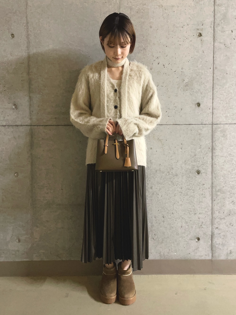 パッチワークが可愛いもちもちのカーディガンに、裾のデザインが可愛いワイドパンツを合わせました!