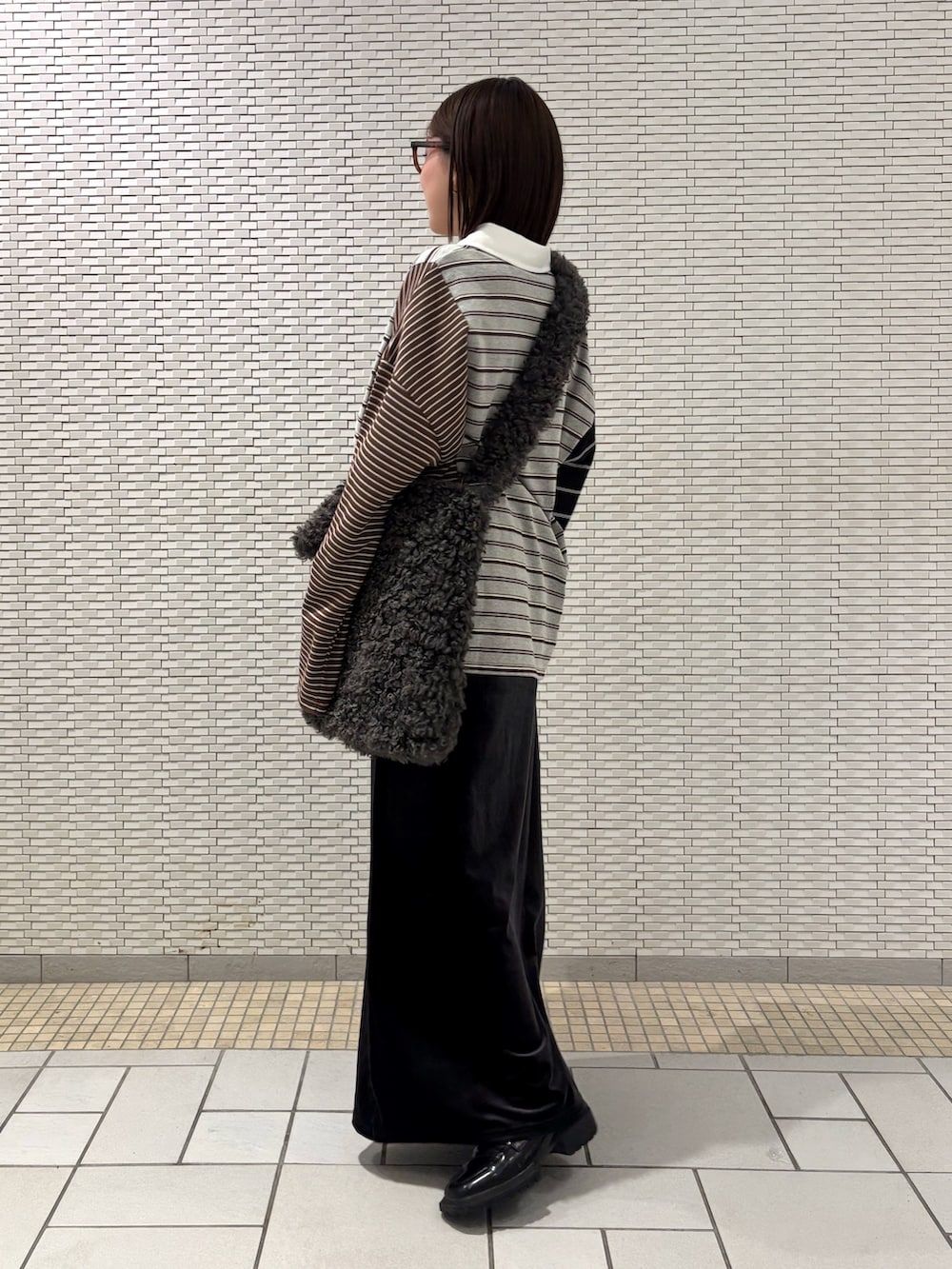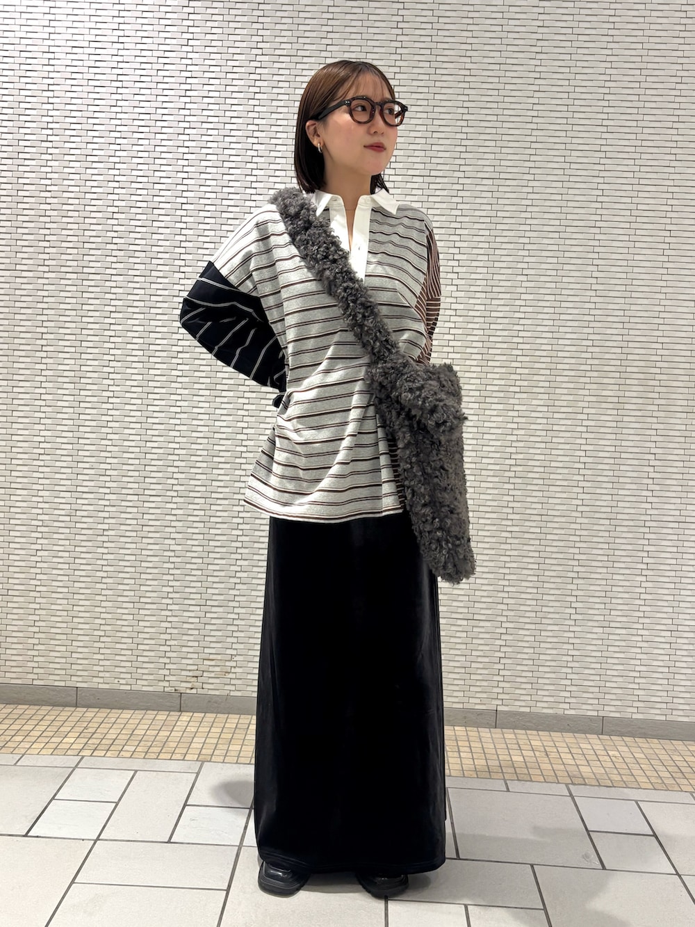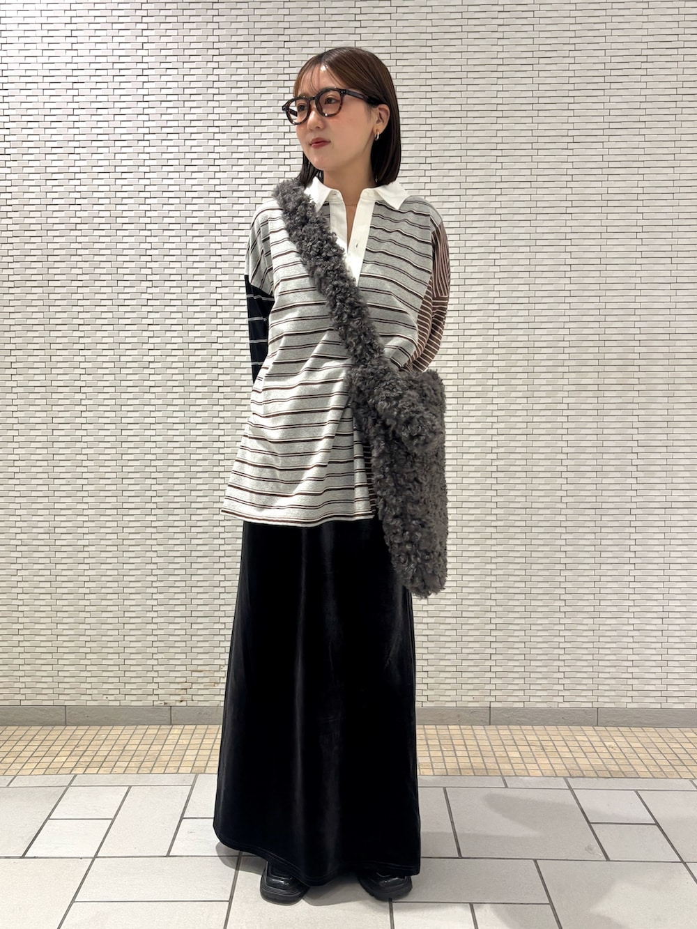 ラガーシャツのグレーとスカートとバッグのチャコールグレー合わせでゆったりコーデ🩶