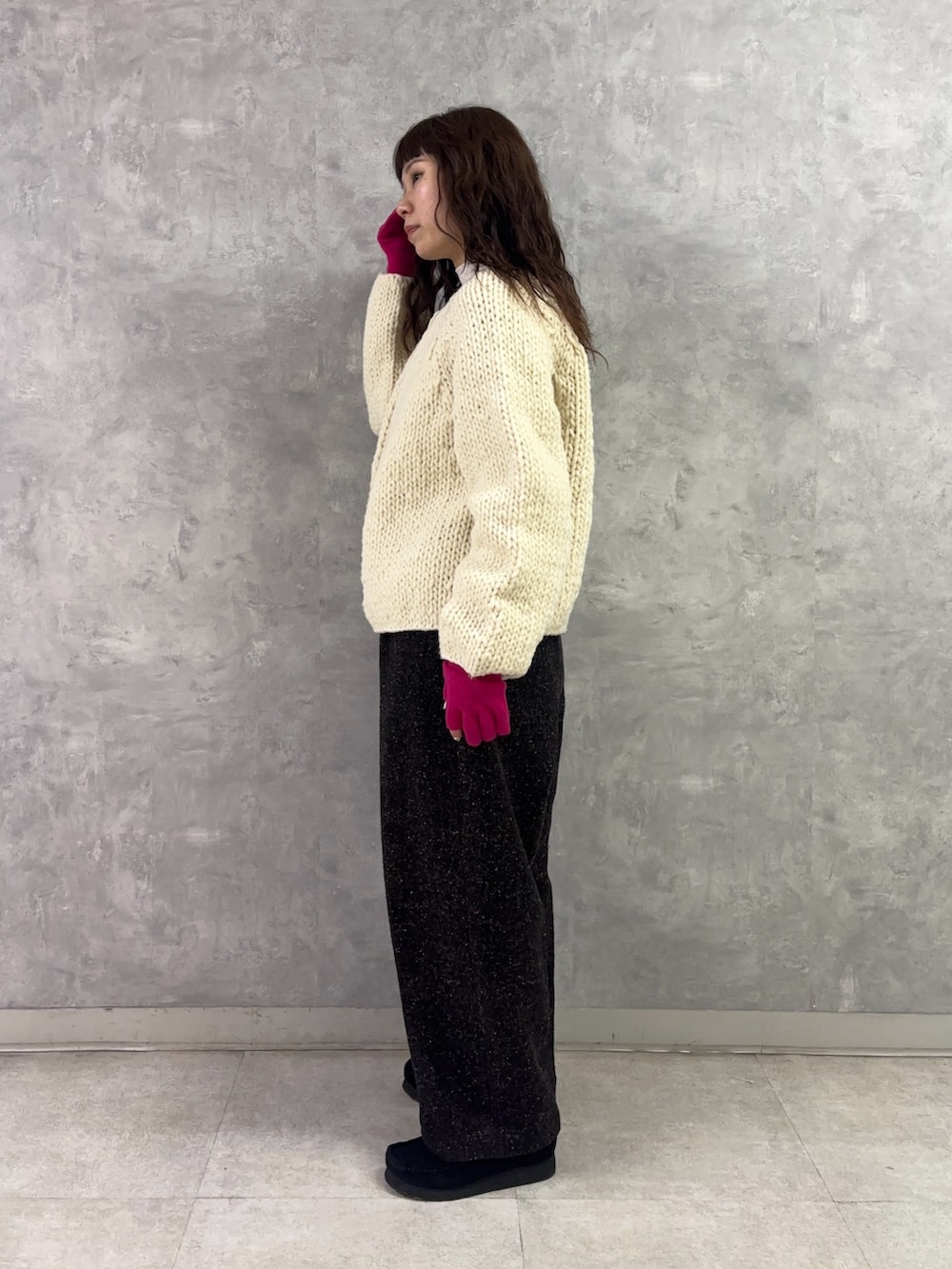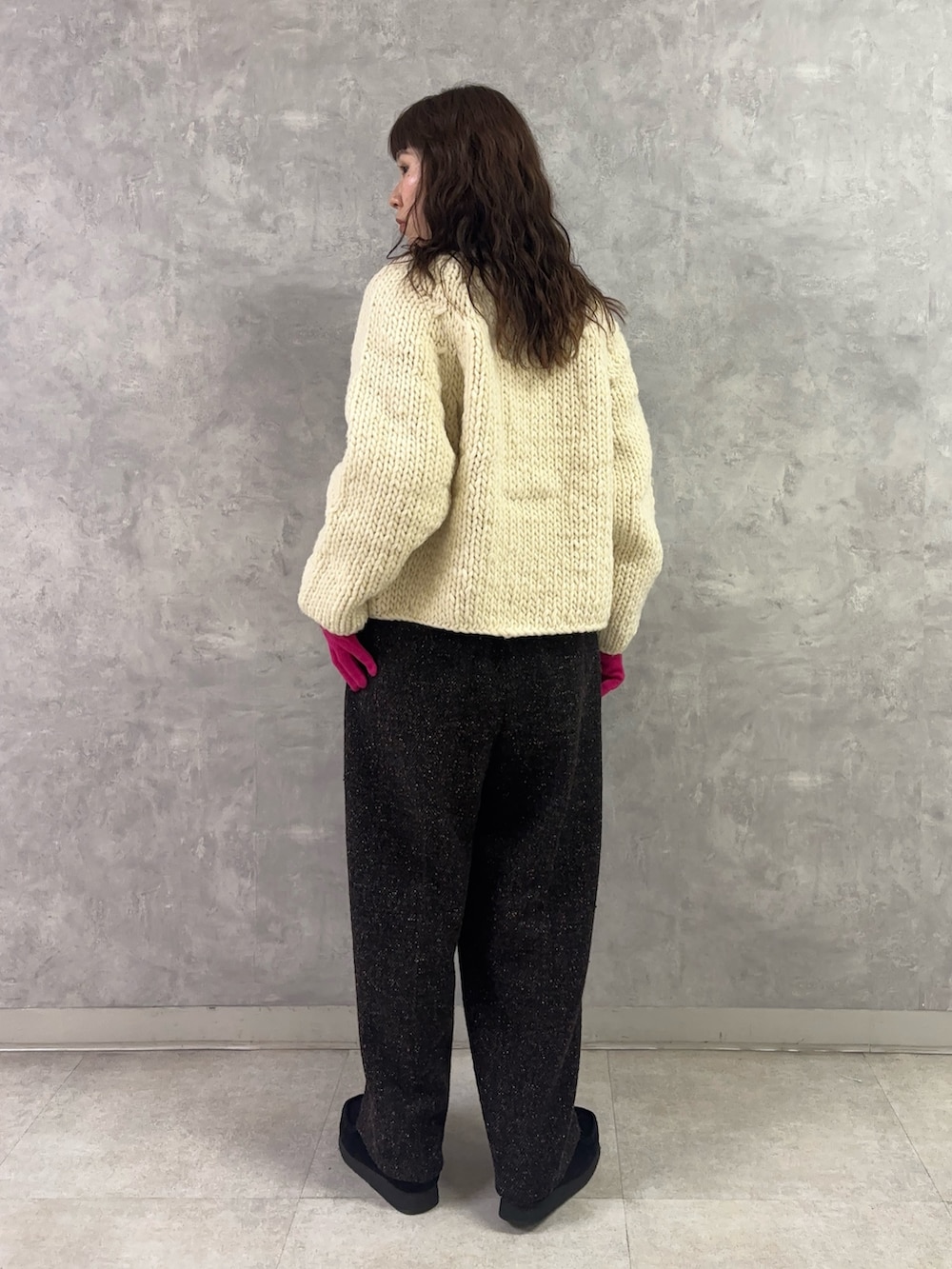 ボトムには温かみのあるヘリンボーン素材の「ツイードスラックス」。