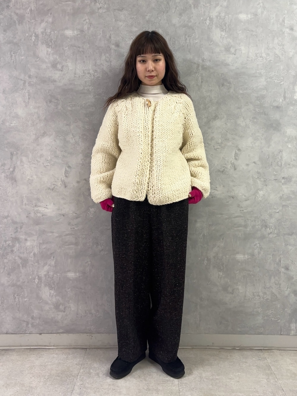 南米ペルーで1着1着丁寧に編み上げられたペルーニットシリーズから、「ペルートグルボタンカーディガン」を着用。