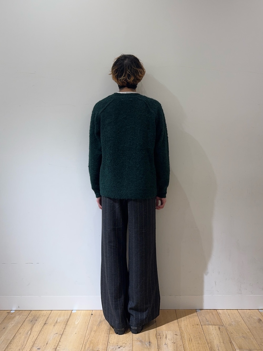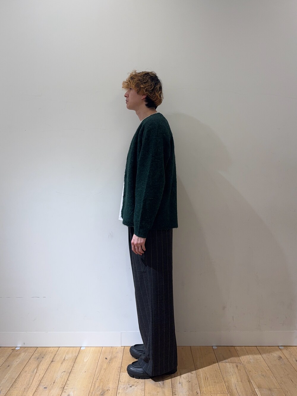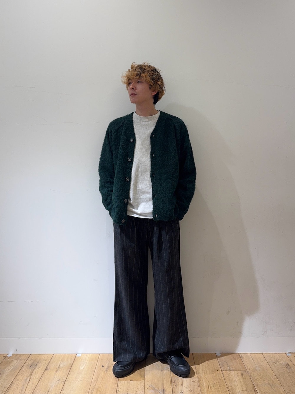 今回はカラーのキレイなシャギーカーディガンを使ったスタイリングです。