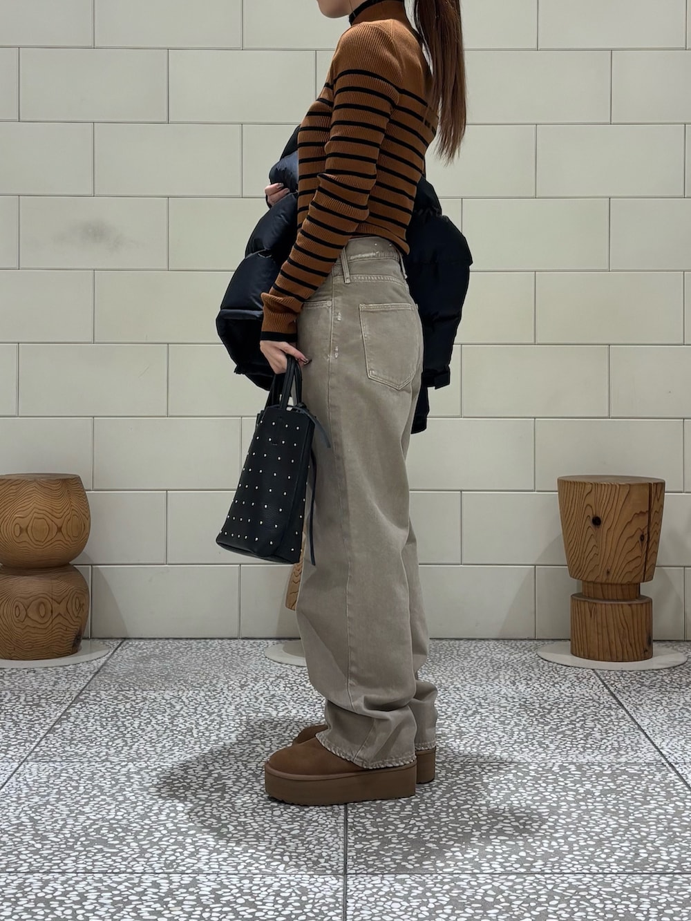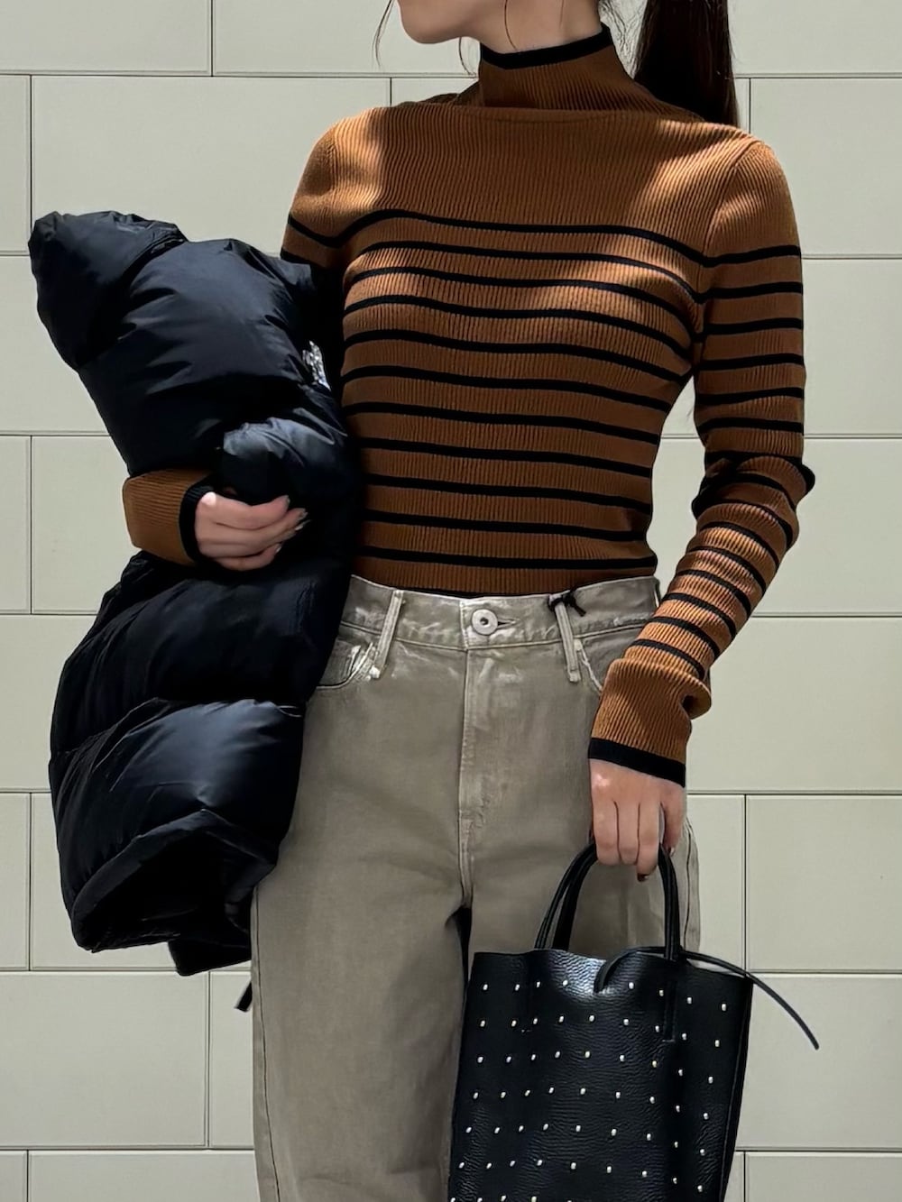 タートルネックのリブニットです。身体のラインを拾うタイトなシルエットでボリュームのあるアウターと相性◎