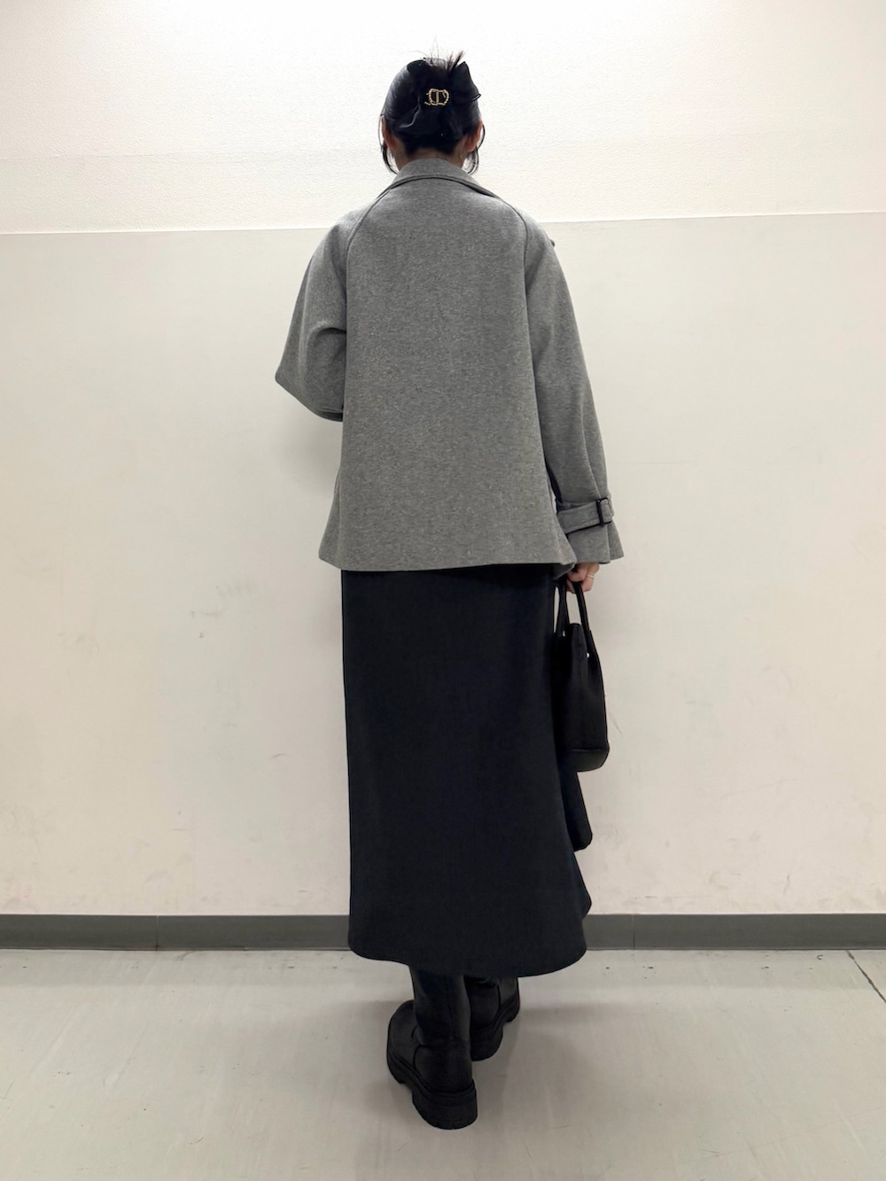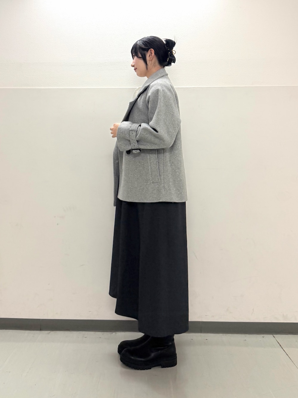 コートをグレーの色味にすることで、甘さを控えめにしました。