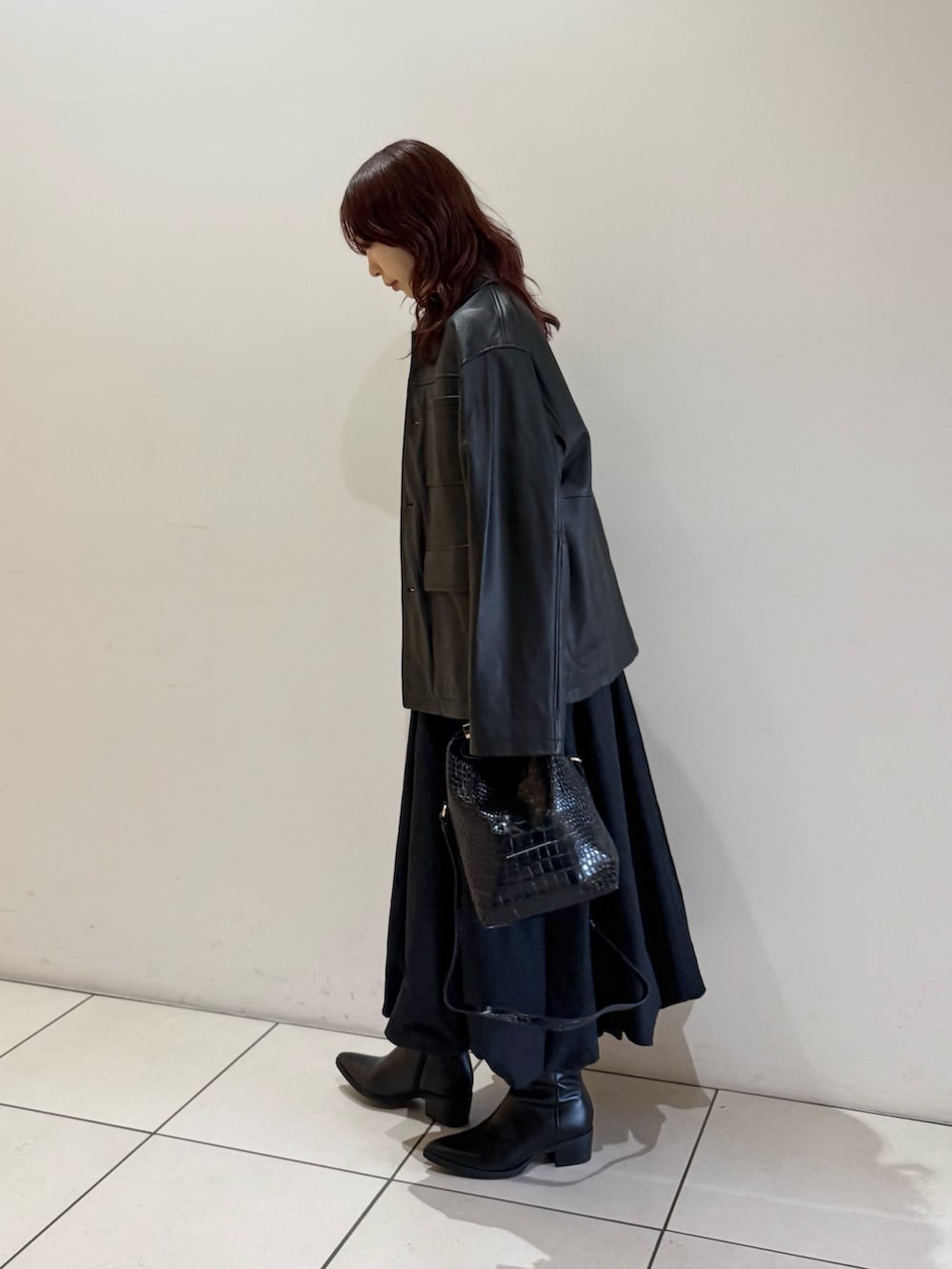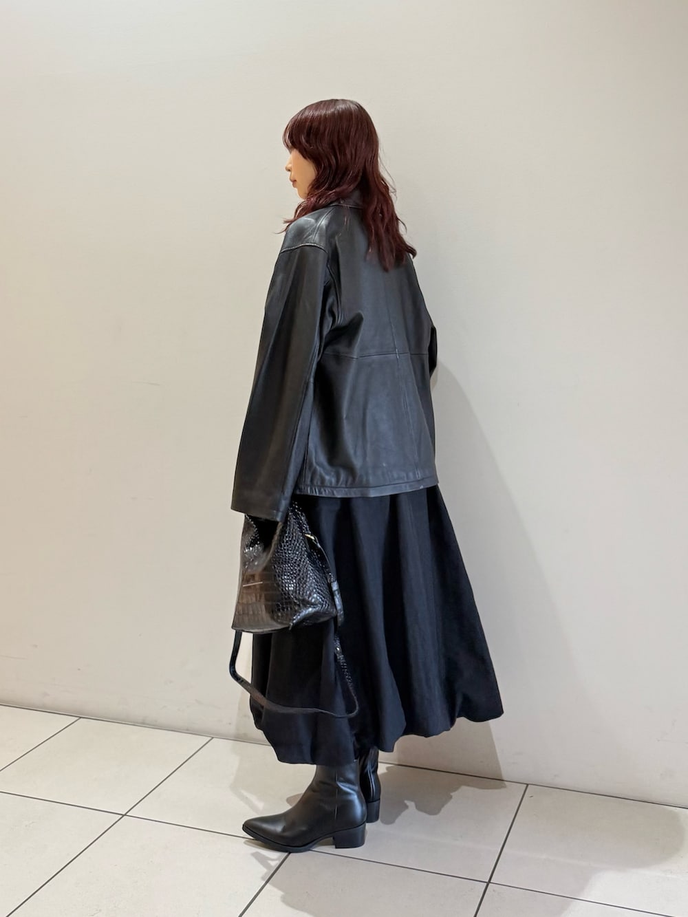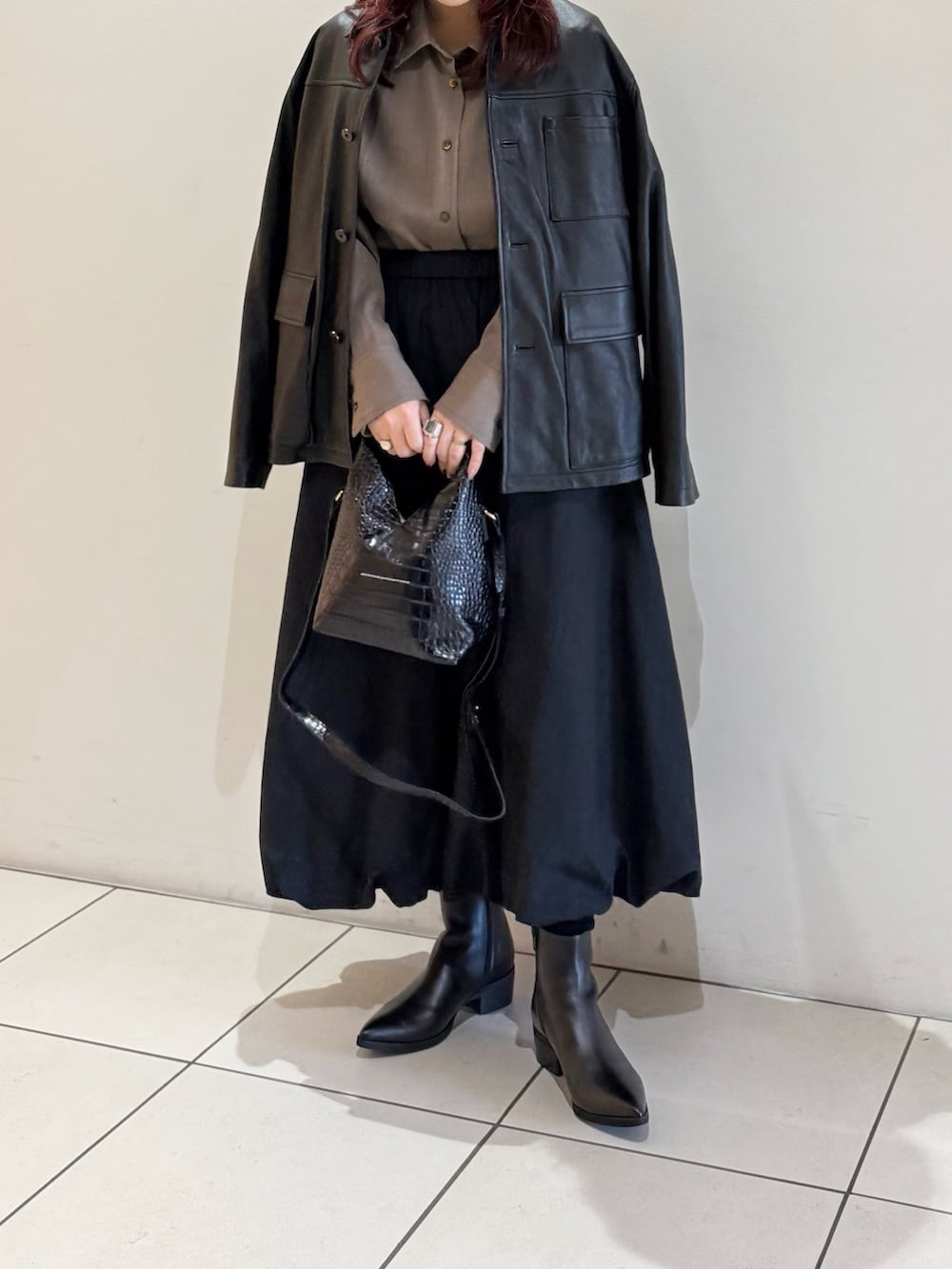 スカートが甘さのあるデザインなので、レザー合わせでモードな雰囲気にまとめました◎
