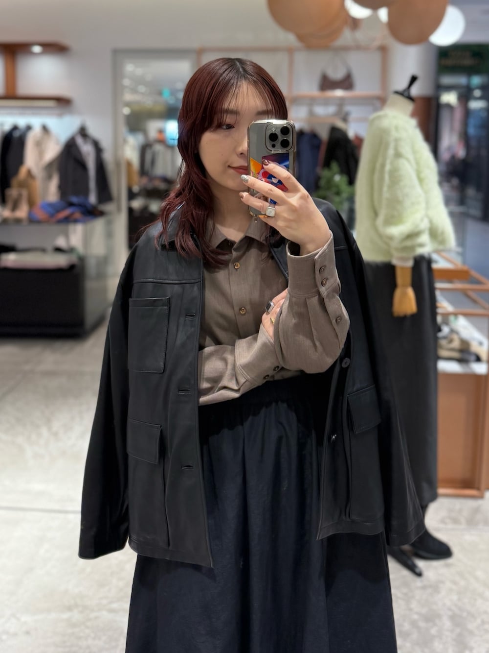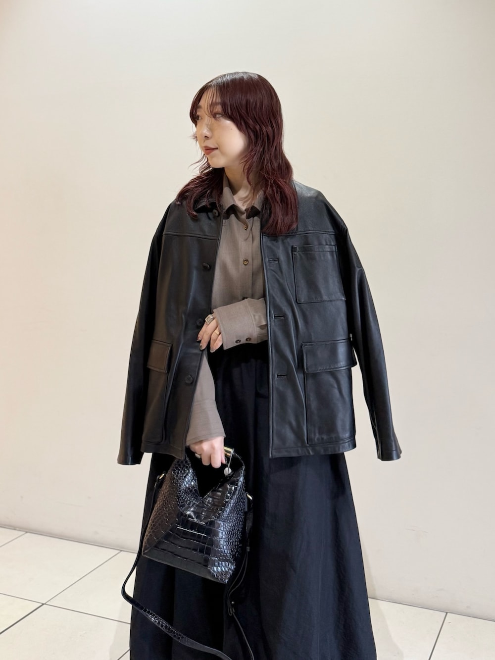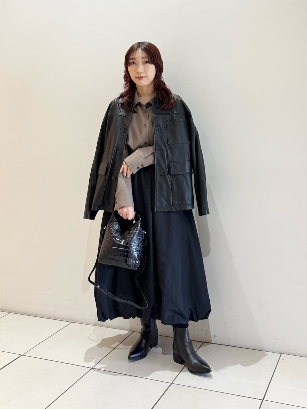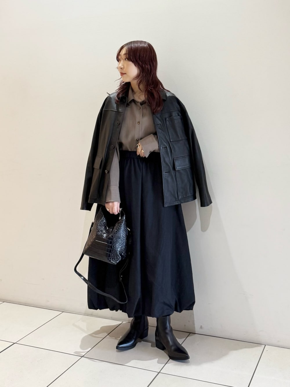 スカートが甘さのあるデザインなので、レザー合わせでモードな雰囲気にまとめました◎