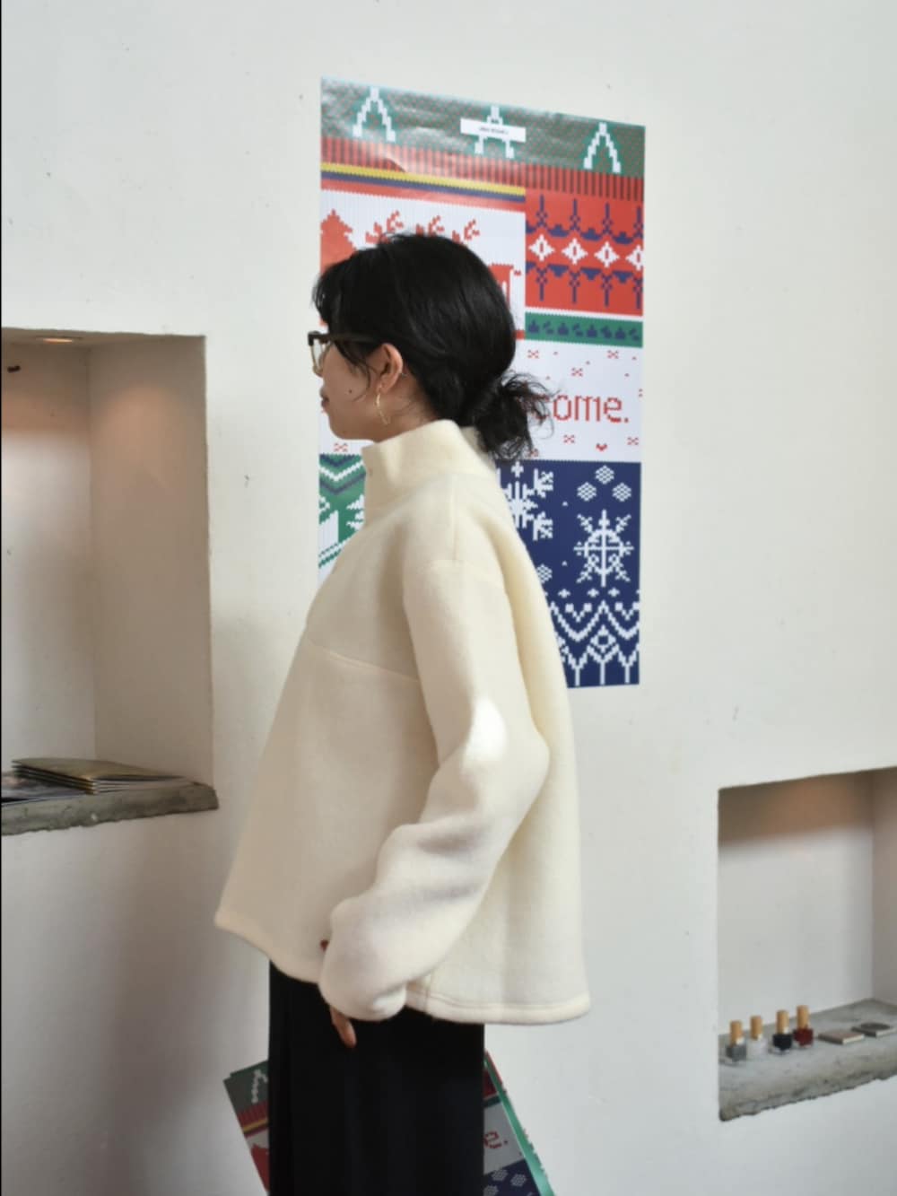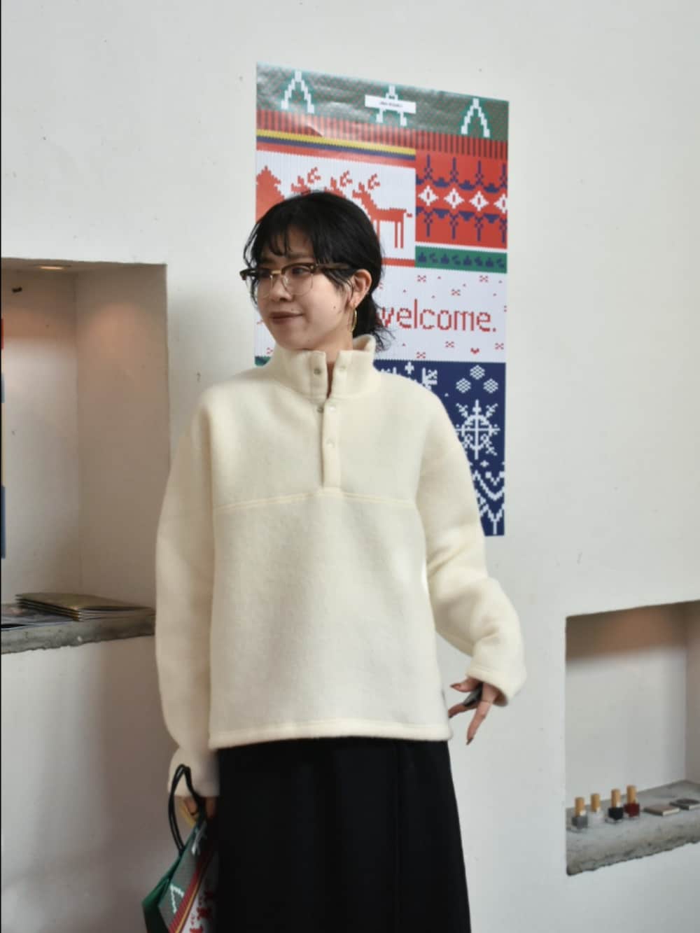 1枚でももちろんチクチク感はないのですが、ゆったりしたシルエットなので、プルオーバーやシャツの重ね着にも◎