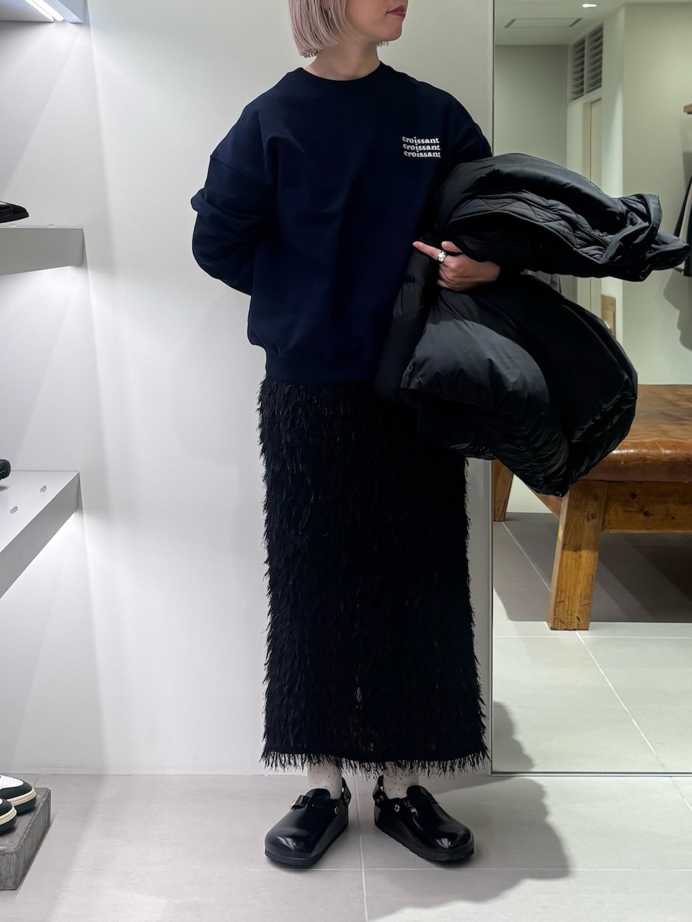 スタイリングに変化を付けてくれる素材のスカート。ウエストはゴムでストレスフリーな履き心地です。
