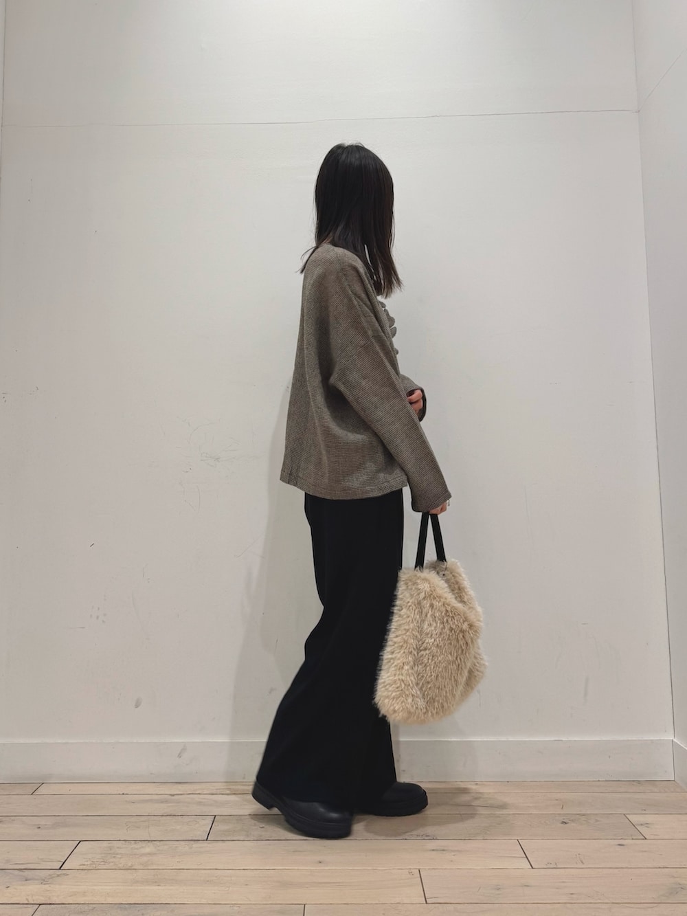 画像では見づらいですが、ブラウスはチェック柄です。胸元のフリルデザインと相まってシンプルなボトムと合わせてもおしゃれな雰囲気に◎
