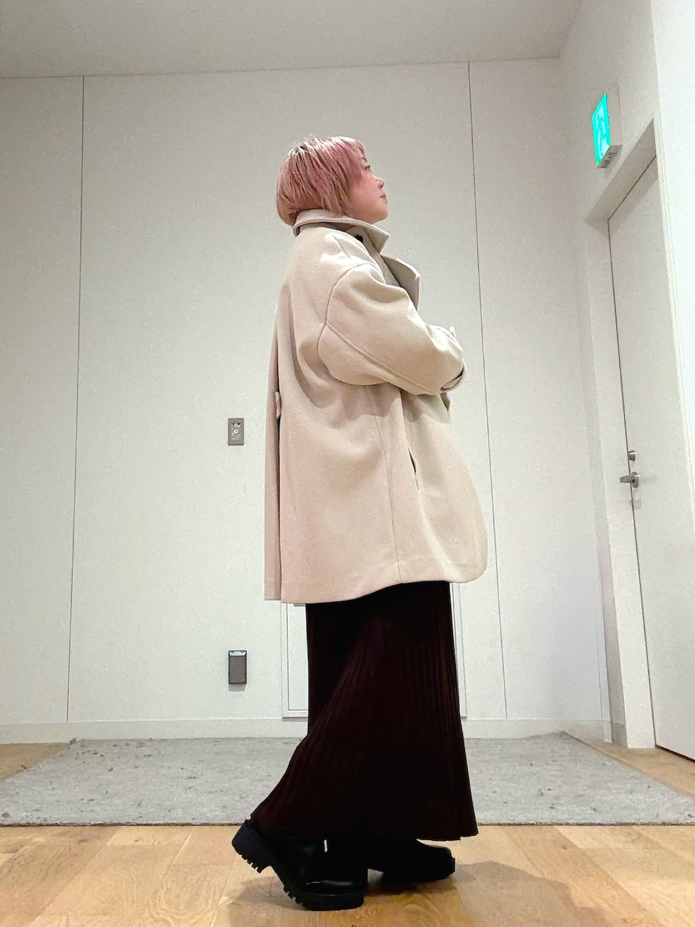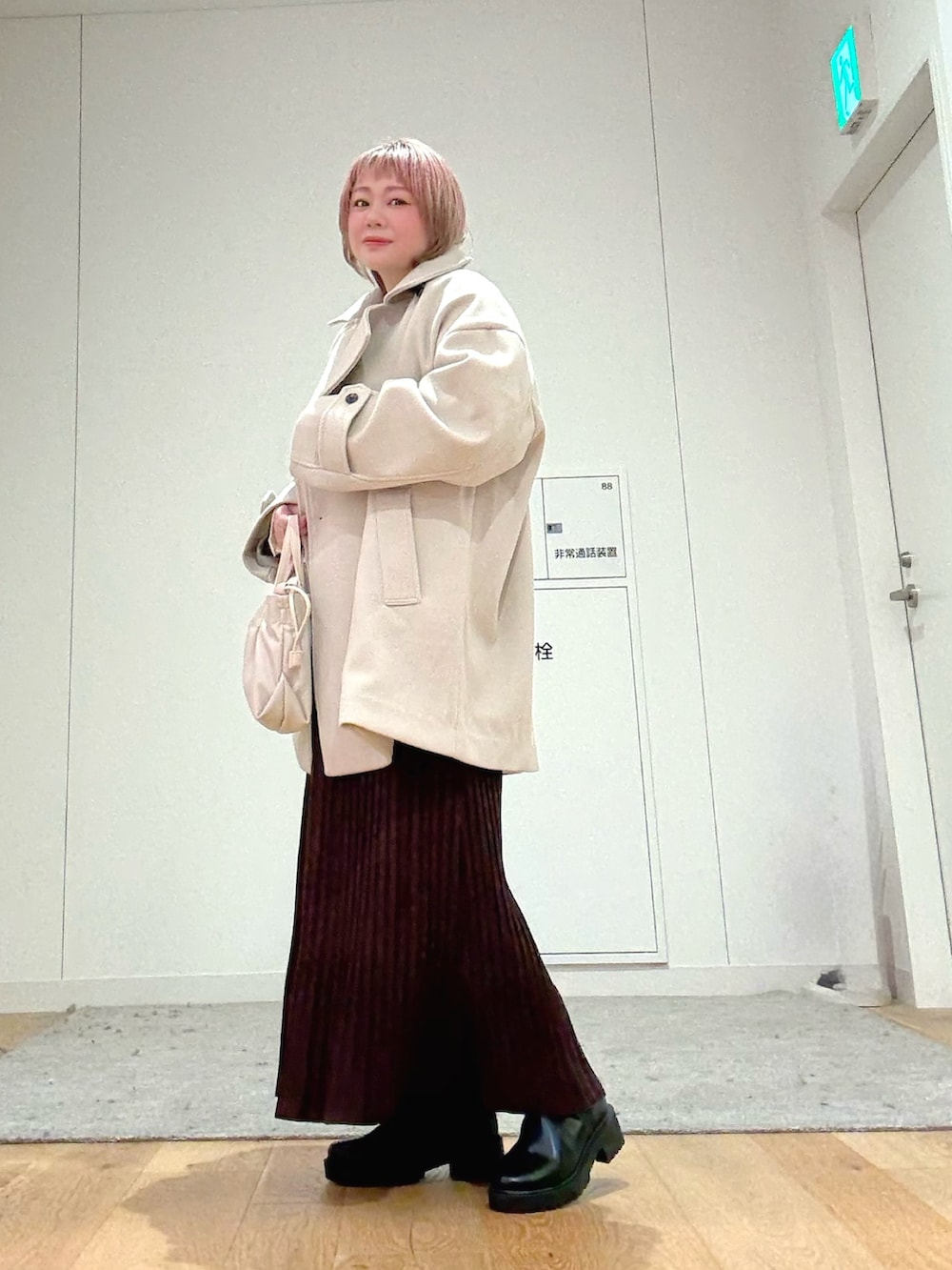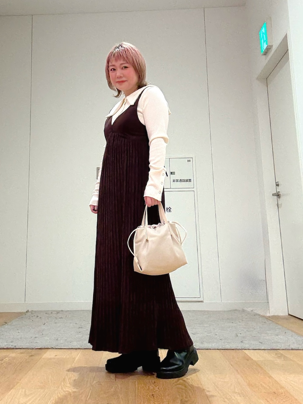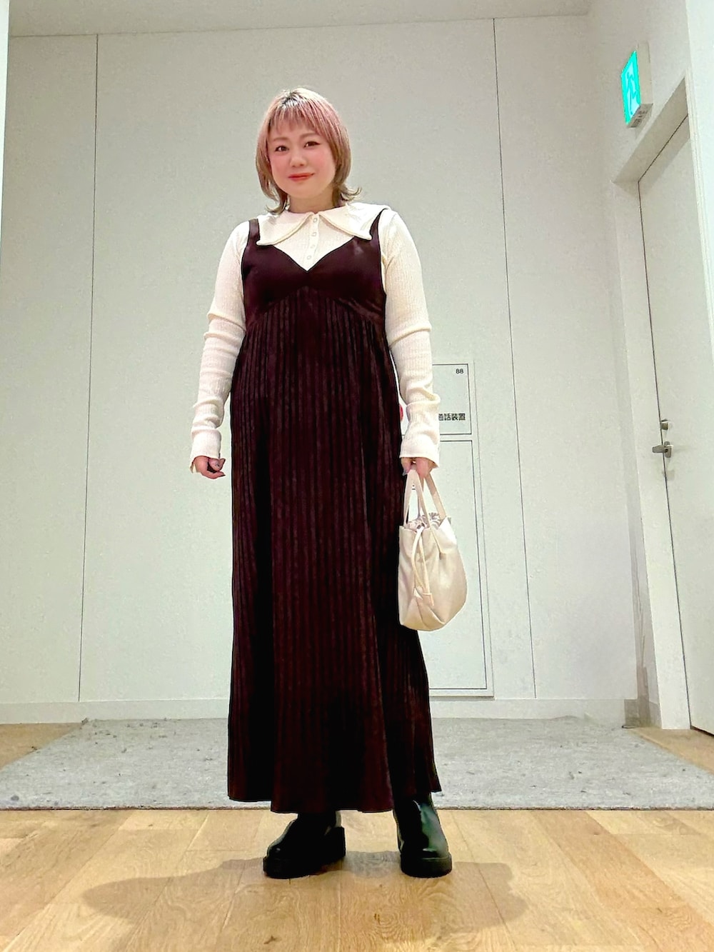 ショートブーツにピーチスキンのプリーツワンピース、セーラーカラーのトップスを合わせました。ピーチスキンの触り心地はとても気持ちいいです。