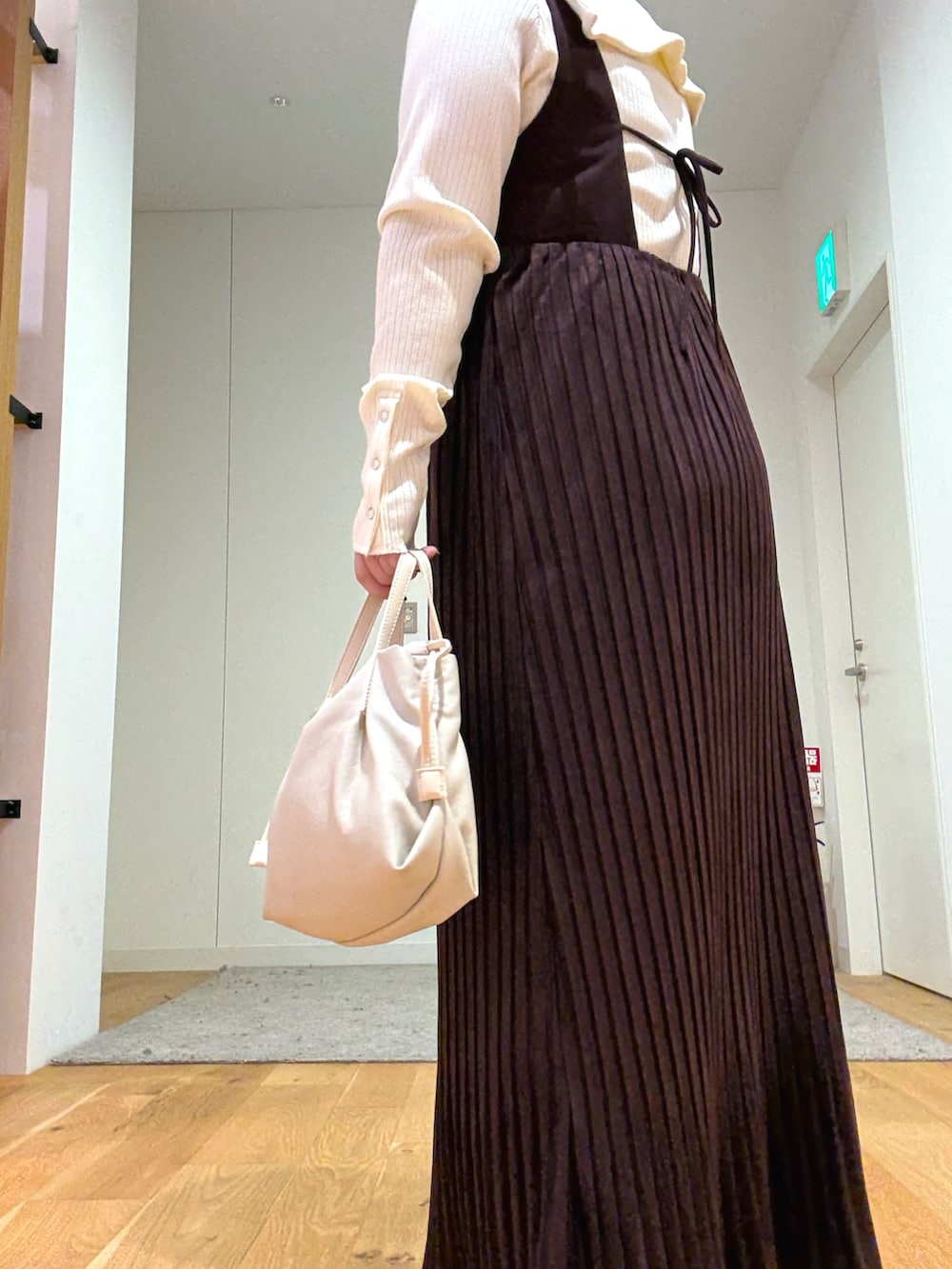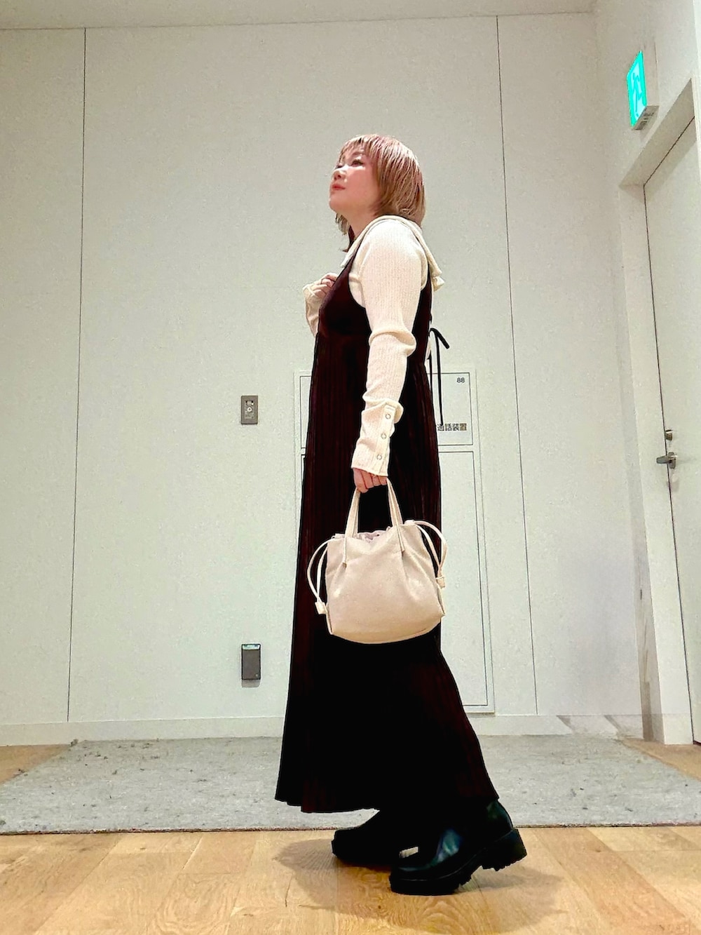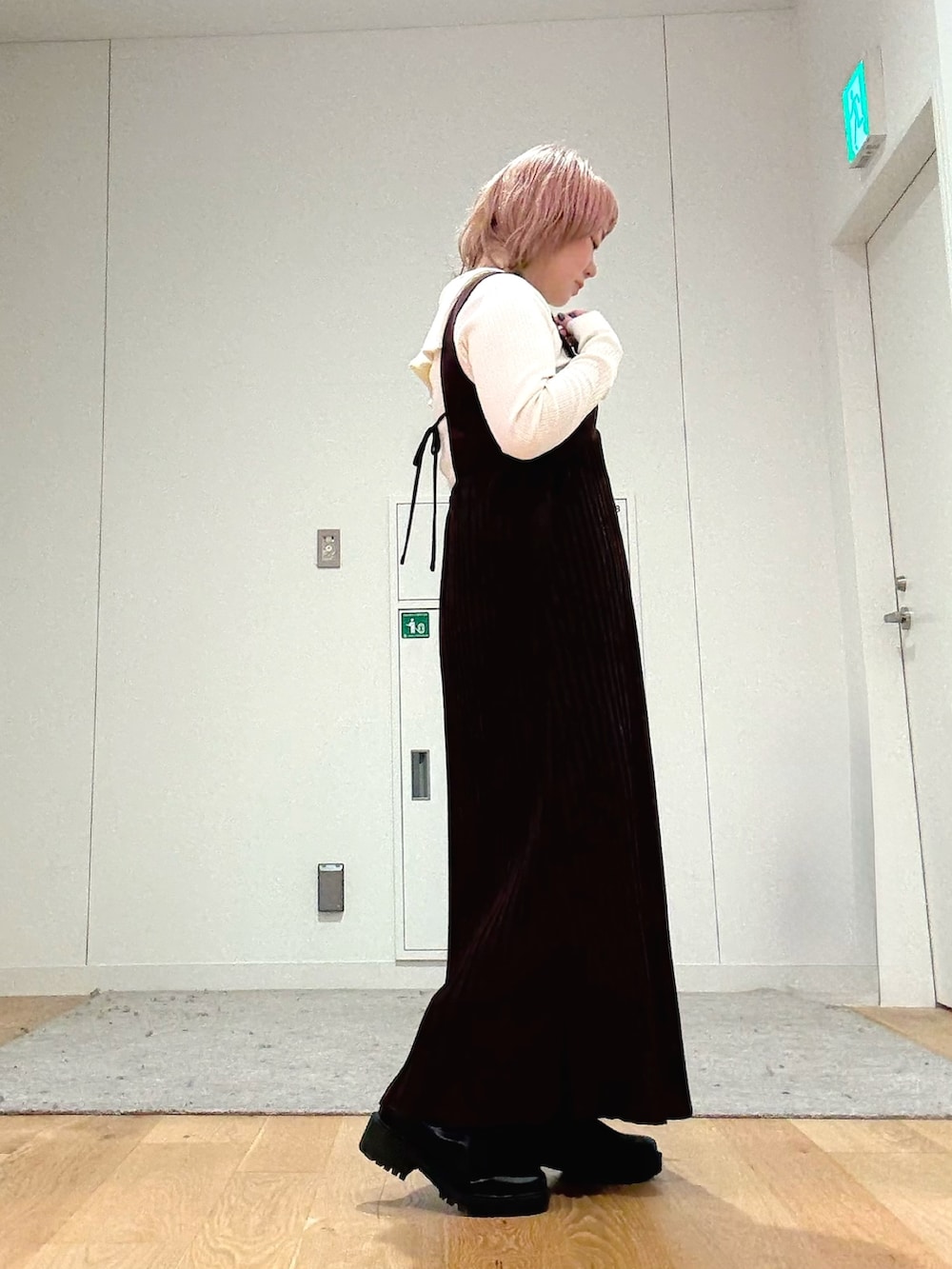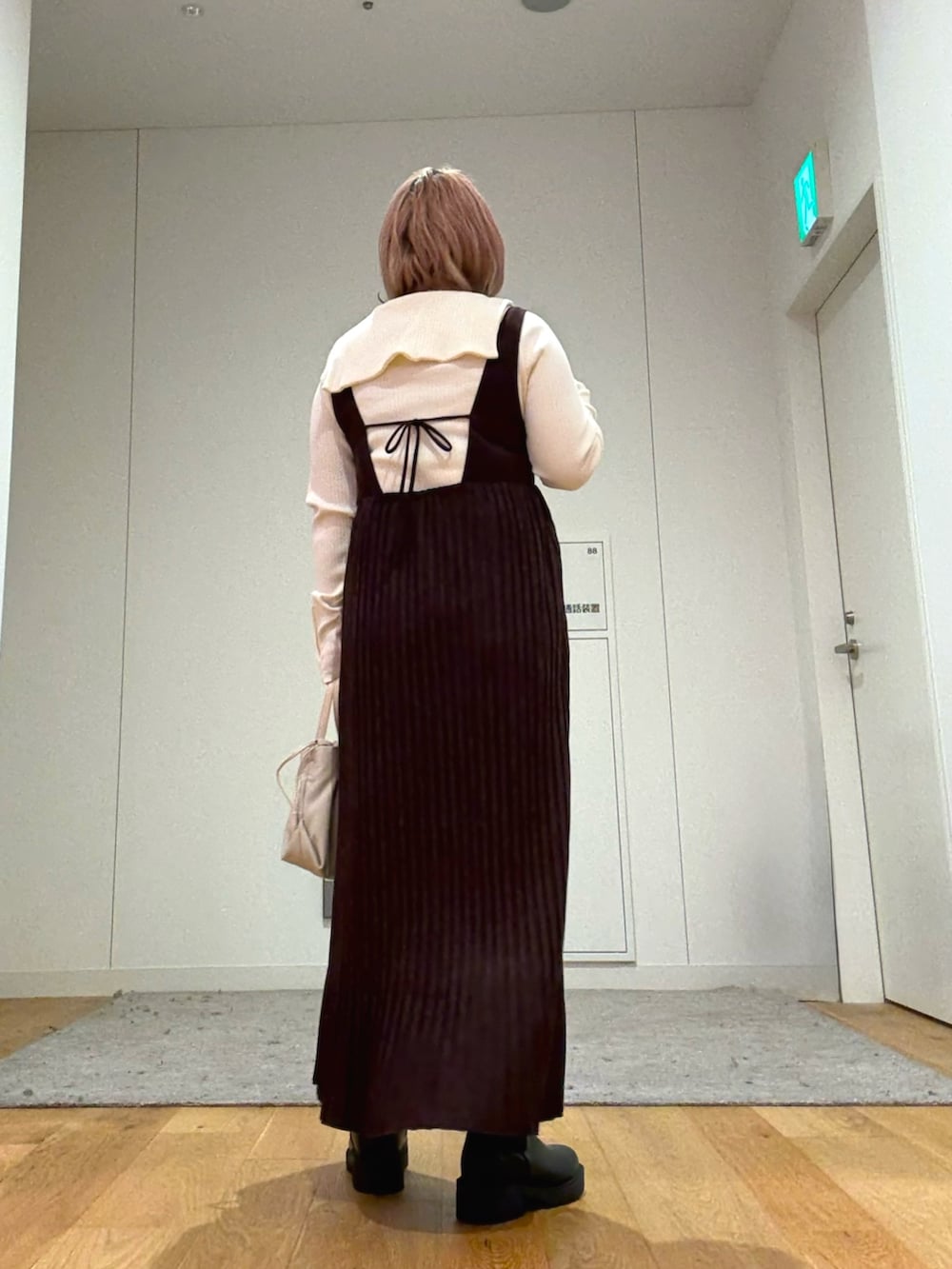 ショートブーツにピーチスキンのプリーツワンピース、セーラーカラーのトップスを合わせました。ピーチスキンの触り心地はとても気持ちいいです。
