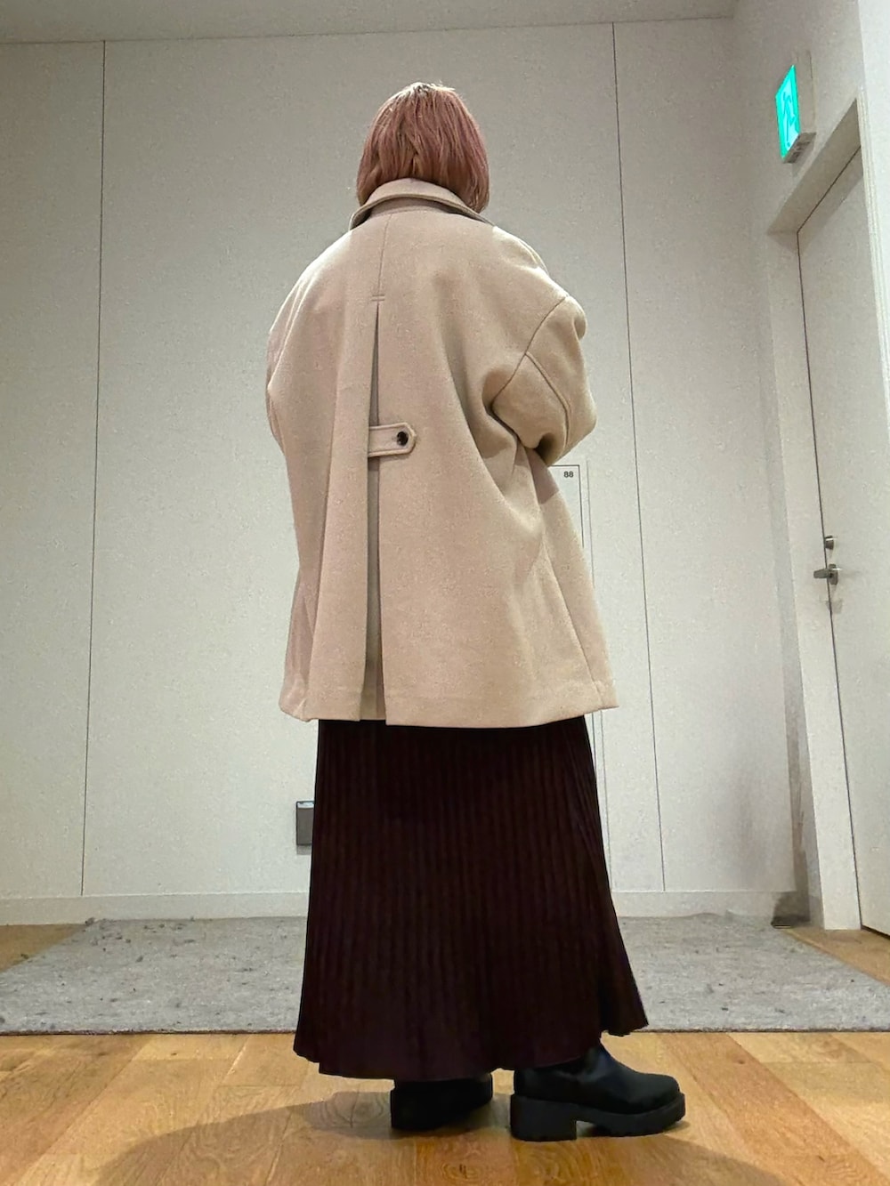 襟やバックのデザインが可愛いアウターは色味も程よく合わせやすいコートです。