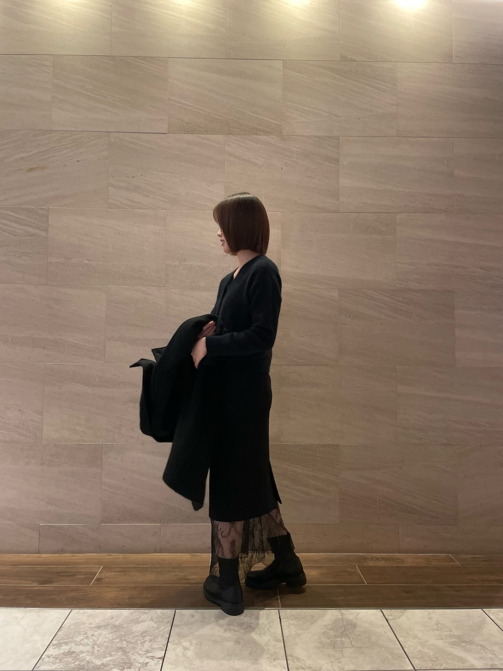 少し光沢感のあるピタッとしたデザインで、レースが可愛いです。コートを羽織っだ時に見えるレースも可愛いです。女性らしいコーデになると思います。