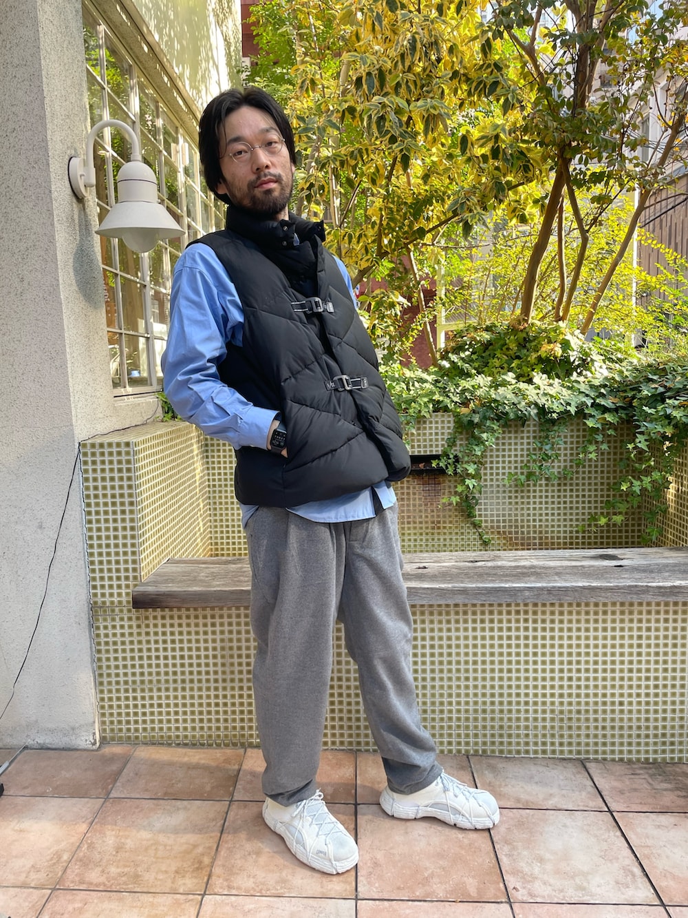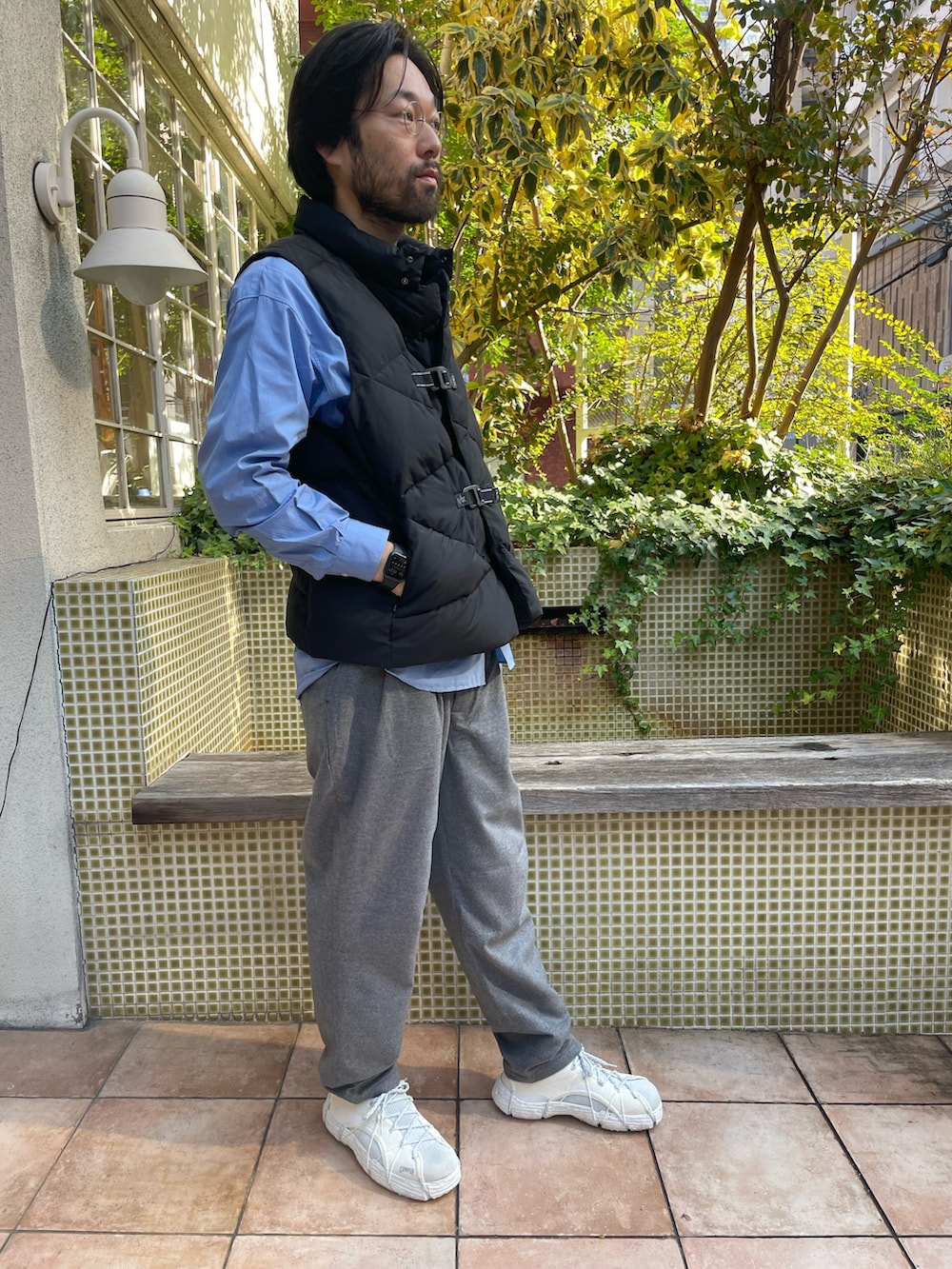 インナーシャツと足元で爽やかカラーを足しつつ、ボトムスはあったかウール素材で季節感を!