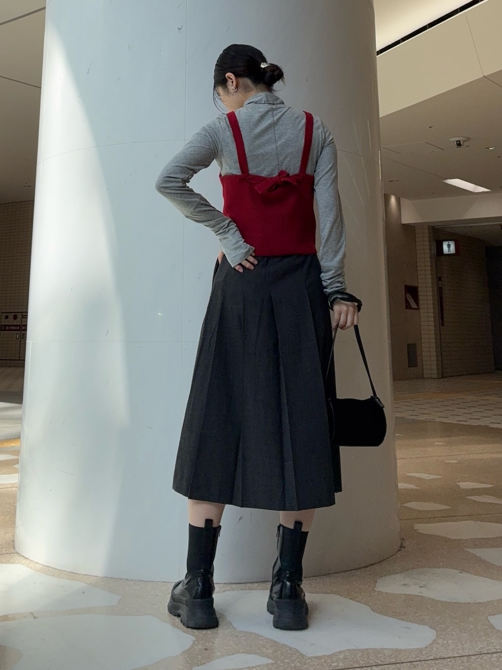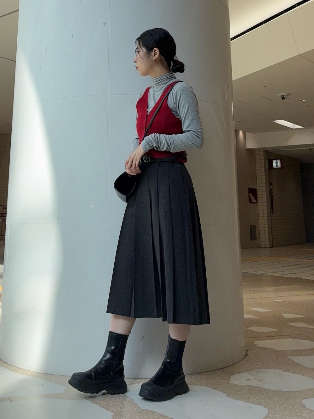 プリーツスカートは膝下くらいの丈なので、ショートブーツ合わせでバランス良く組んでみました!