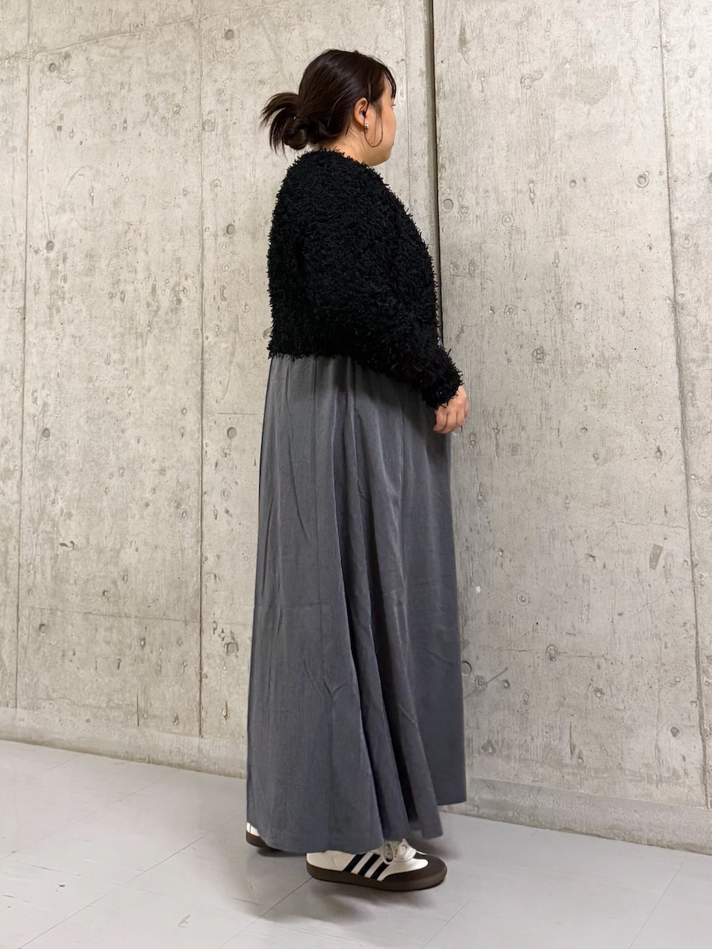 カーディガンはチュールのフリンジデザインが可愛く、丈感が短いのでどんなコーデにも合わせやすくて◎