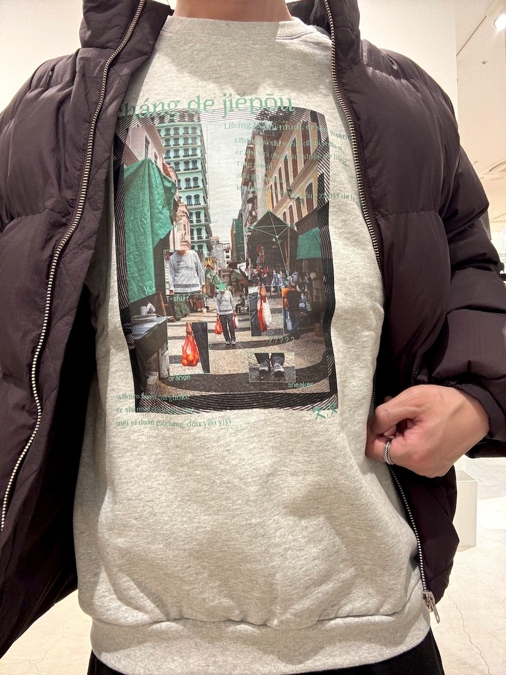 シティグラフィックスウェットにパープルのブルゾンを羽織ってみました!シティグラフィックスウェットのプリントが素敵なデザインとなっています!
