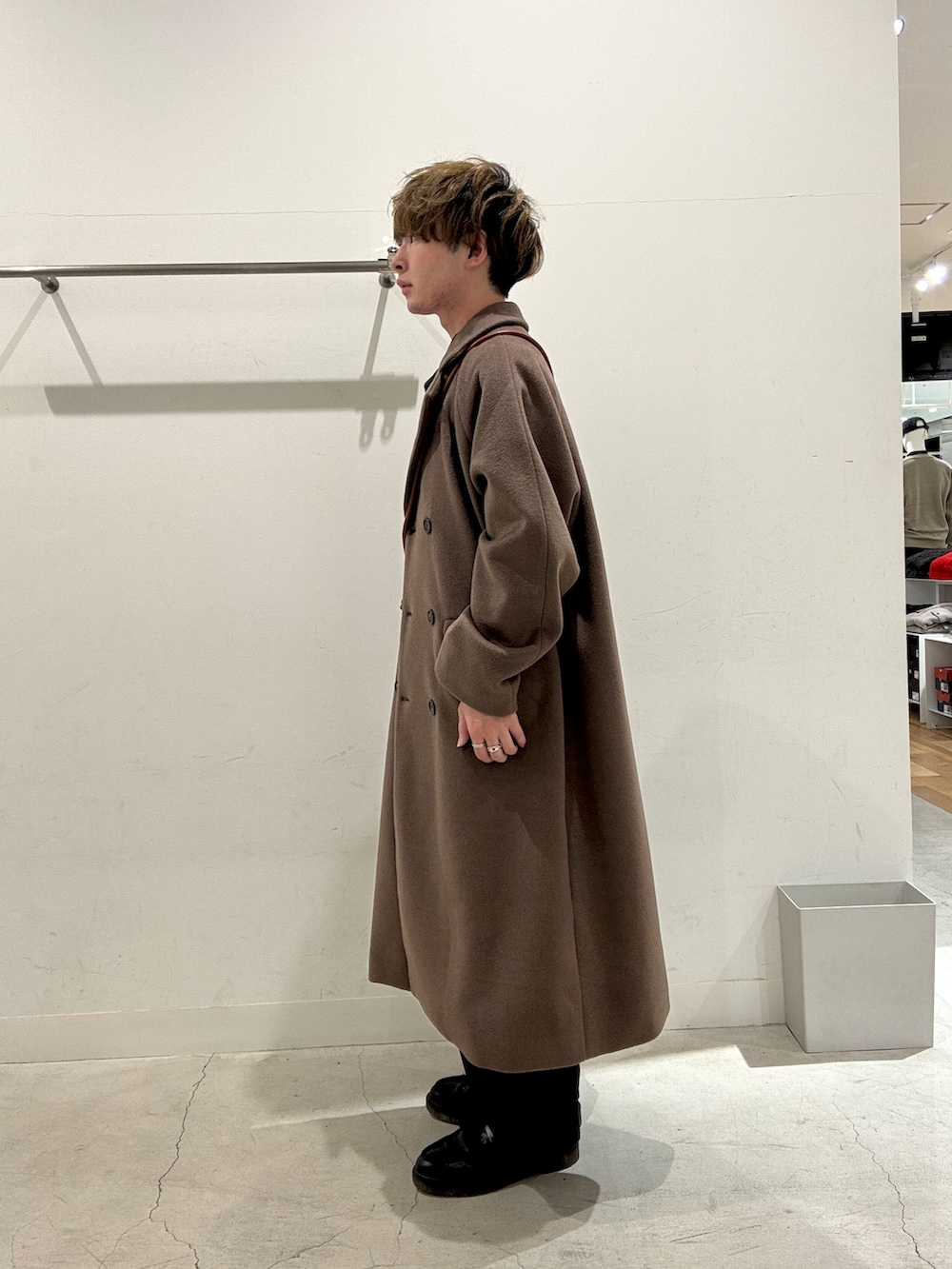 ネイビーのバンドカラーシャツにブラウンのロングコートを羽織り、差し色でオレンジの小物を身に付けてみました!