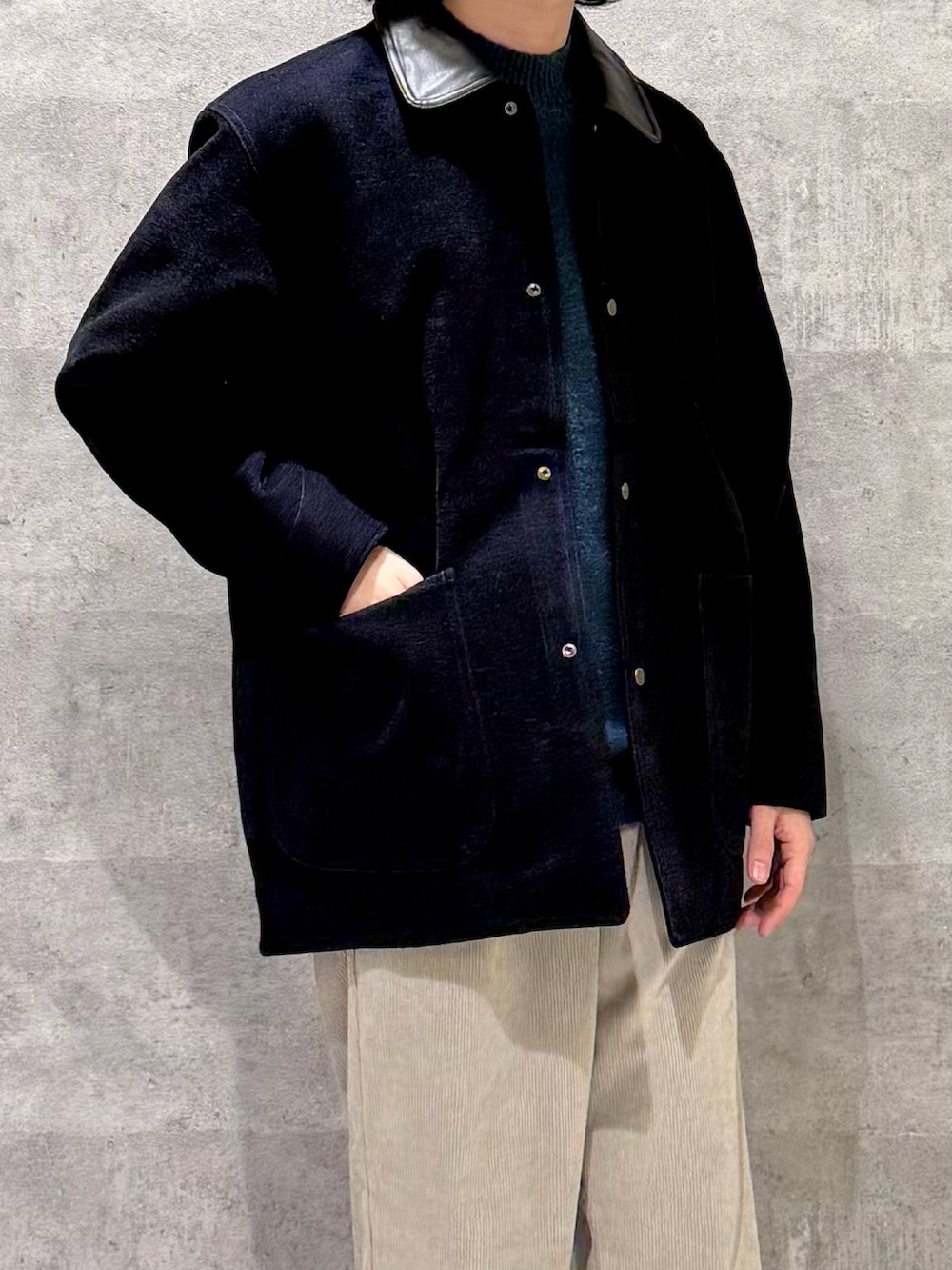 襟がシンセティックレザーのエレガントな雰囲気のジャケット。