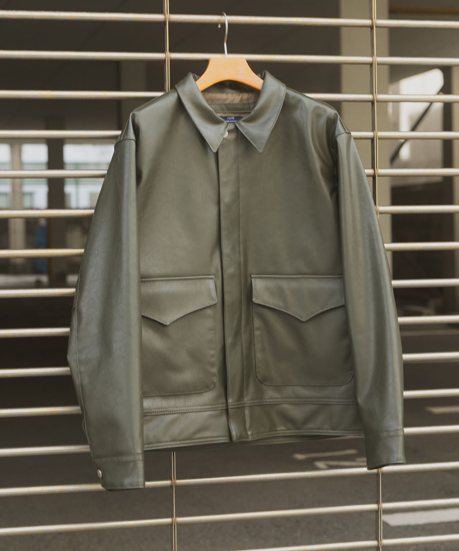 こちらのジャケットはフェイクレザーでカラーがカーキと少し珍しい色合いになってます!