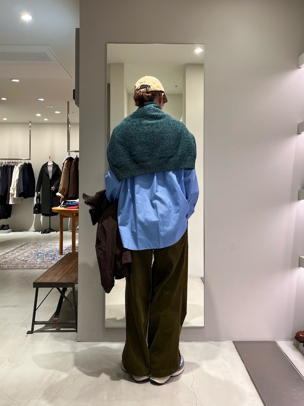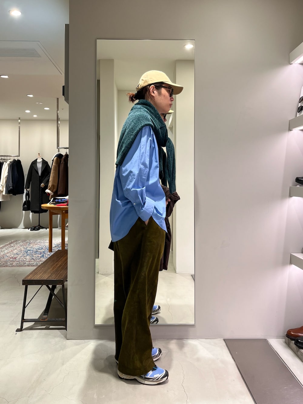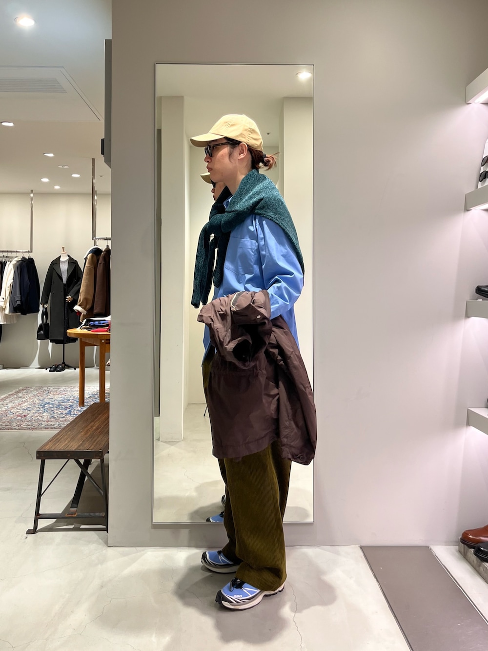 ポイントは肩掛けのローゲージニットに季節感のでるATONのアウターです!