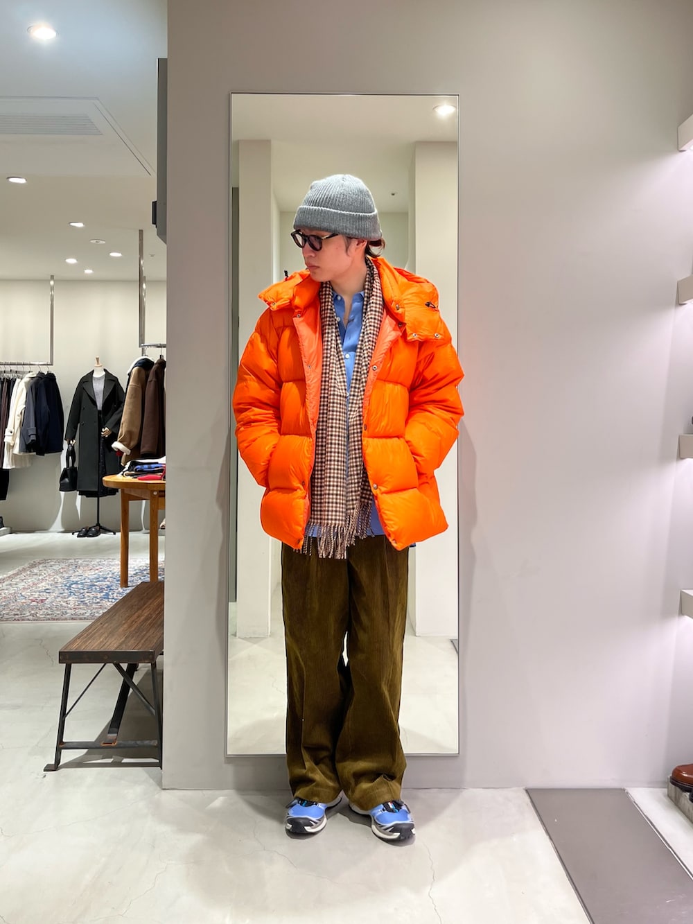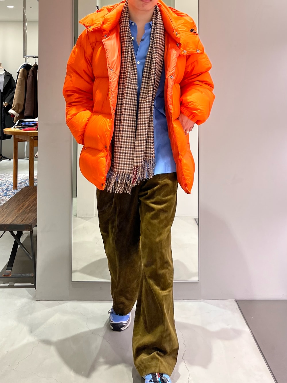 ポイントはロイヤルカラーのシャツにkafjiのオレンジダウン、差しカラーで追いチェックマフラー季節感のホリデースタイルです!