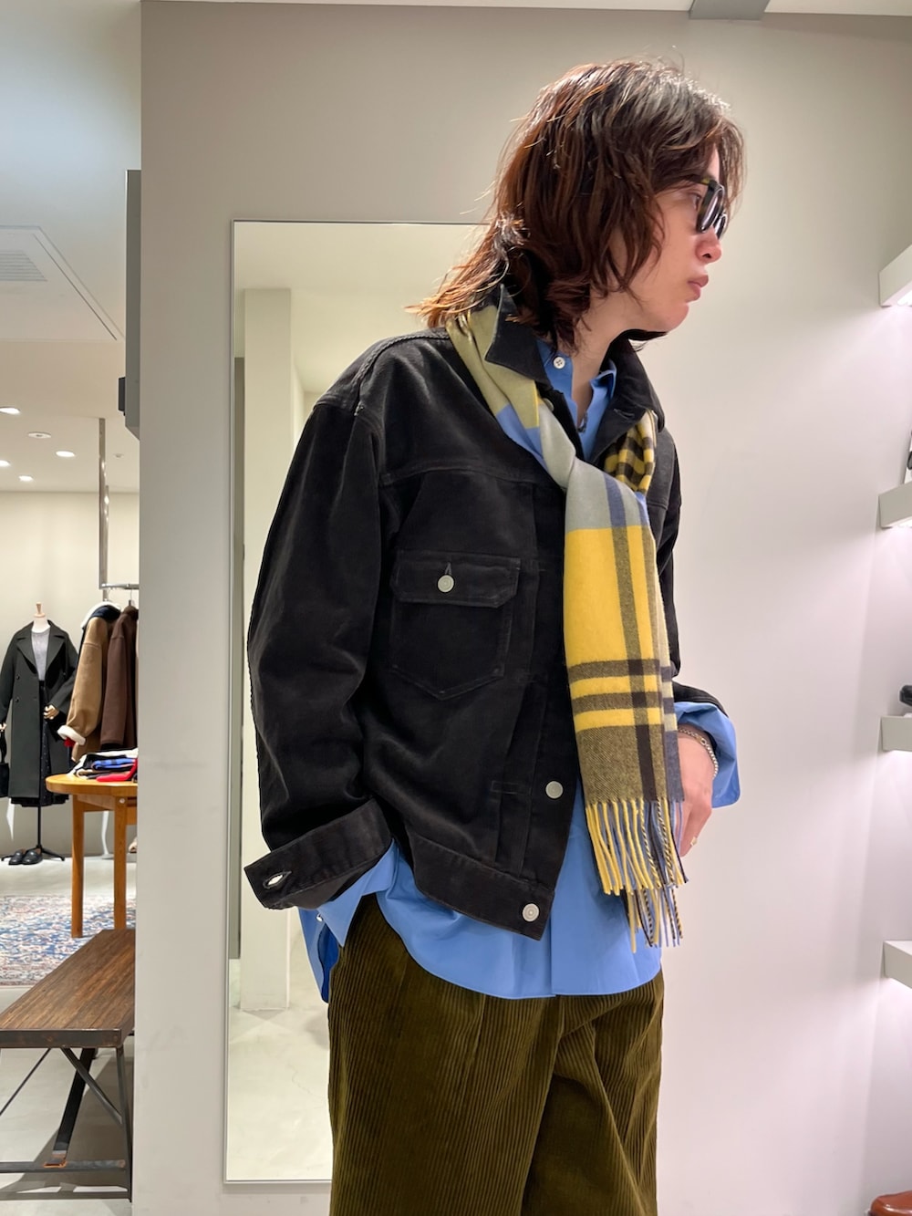 ポイントはコーデュロイジャケットに同色のチェックマフラー、パンツのカラーも拾ってます!