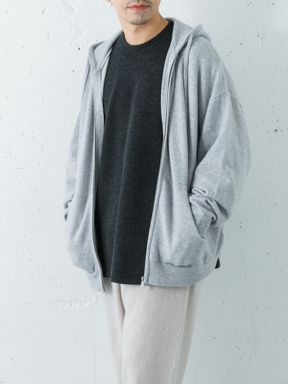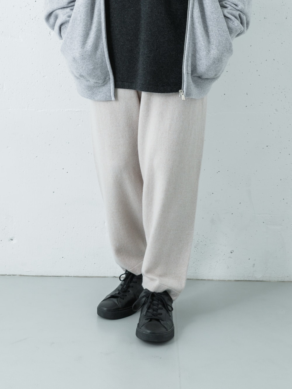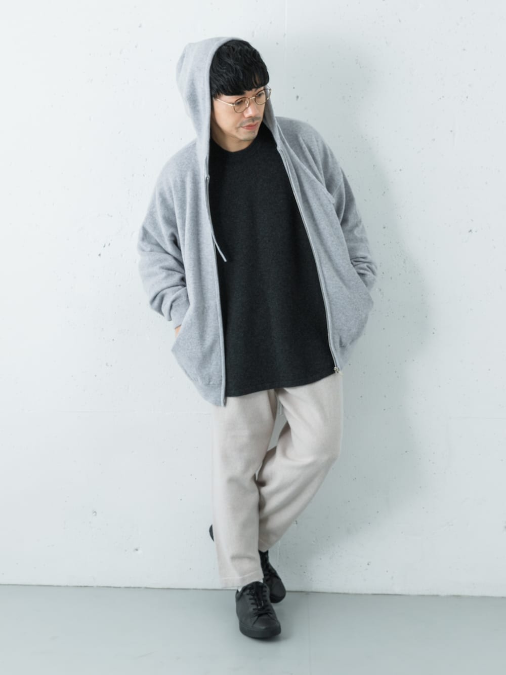 パーカーで全体がワイドなコーデなのになぜかキレイに見えるのがカシミア効果ですね。